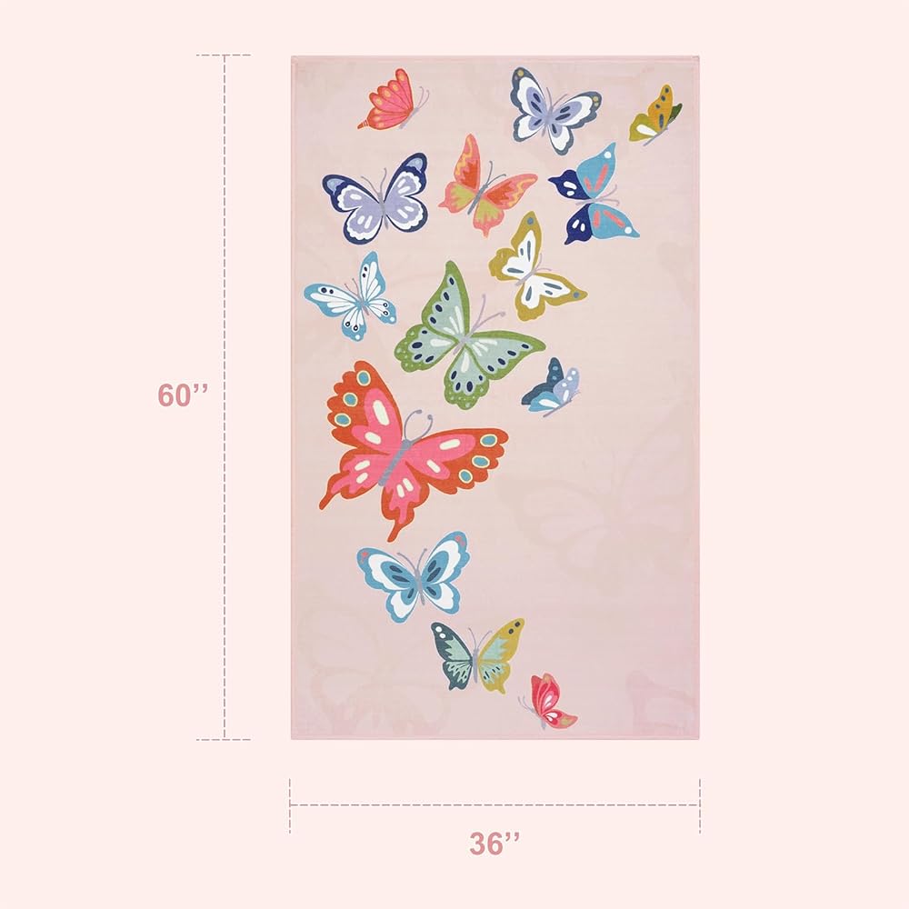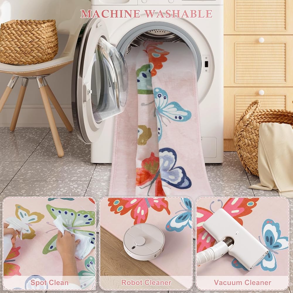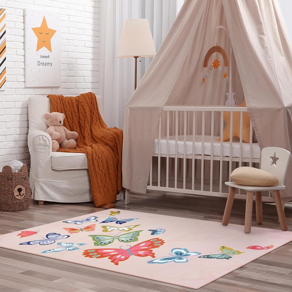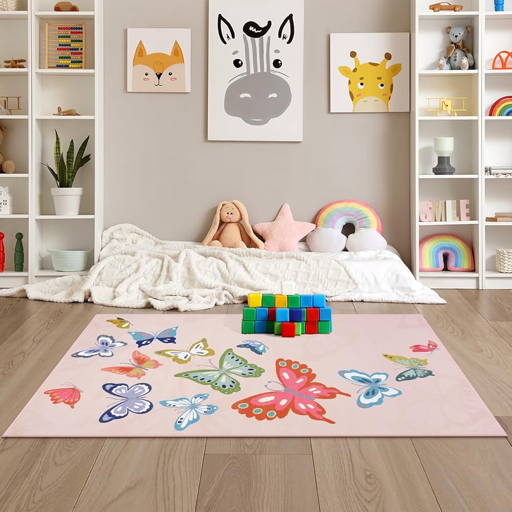 Dreamy Butterfly Design:Adopting unique butterfly element design, lovely pattern, soft and bright colours, this girl rug suitable for kids room, playroom, baby nursery, bedside and other scenes, adding a childish atmosphere, creating a warm and dreamy space