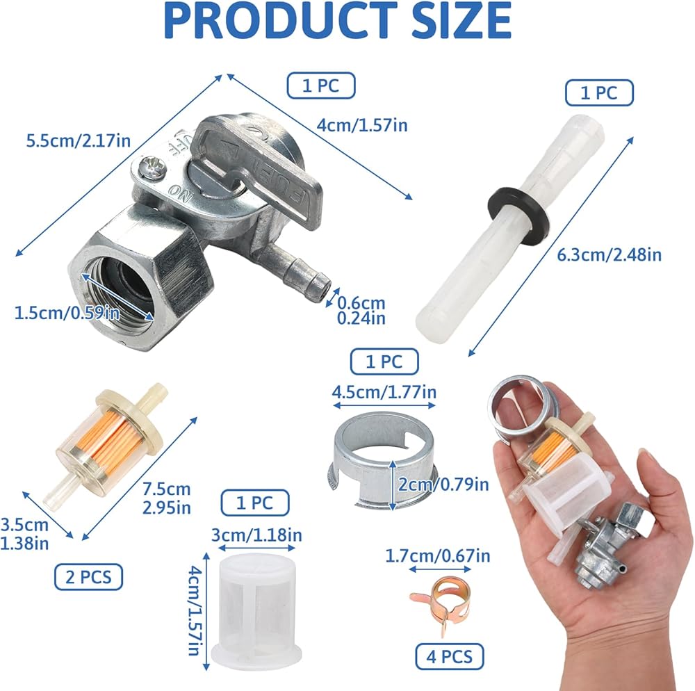 [Package Contents]The internal thread oil transfer switch valve kit includes 1 internal thread oil transfer switch valve, 2 inline fuel filters, 1 tank filter with fixed iron ring, 4 clamps
