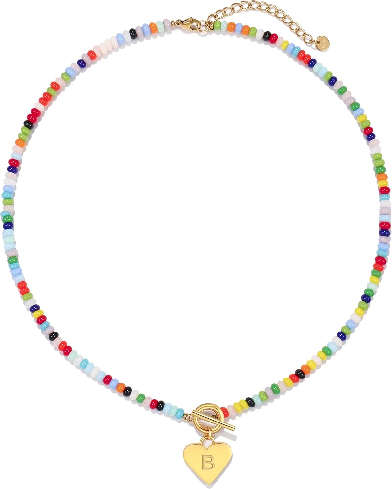 Badu Initial A-Z Colorful Beaded Gemstone Necklaces for Women 14K Gold Plated Waterproof Heart Boho Necklace Natural Stone Cute Jewelry Gifts Sister, best friend, Birthday,Anniversary or teens