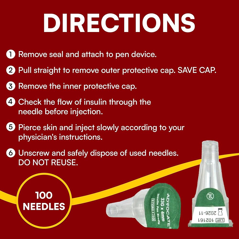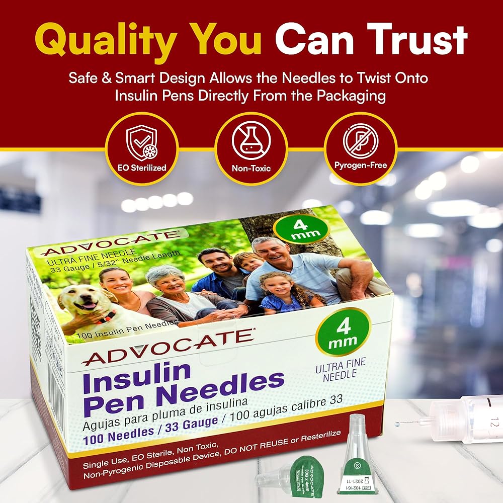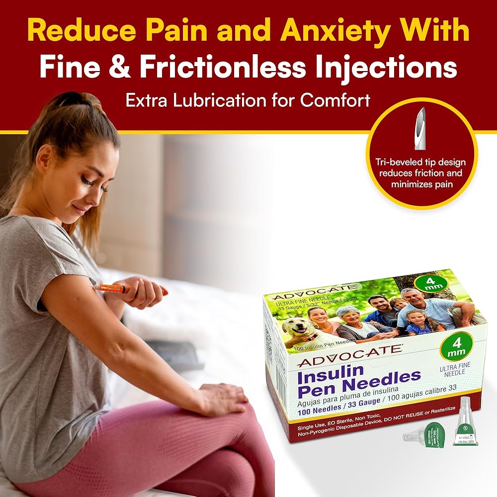 Smooth, comfortable injections: Advocate pen needles feature an extra lubricated design, reducing friction for smoother, virtually painless injections. The ultra-fine engineered tri-bevel tip enhances comfort and precision, further reducing the pain & stress of daily injections.