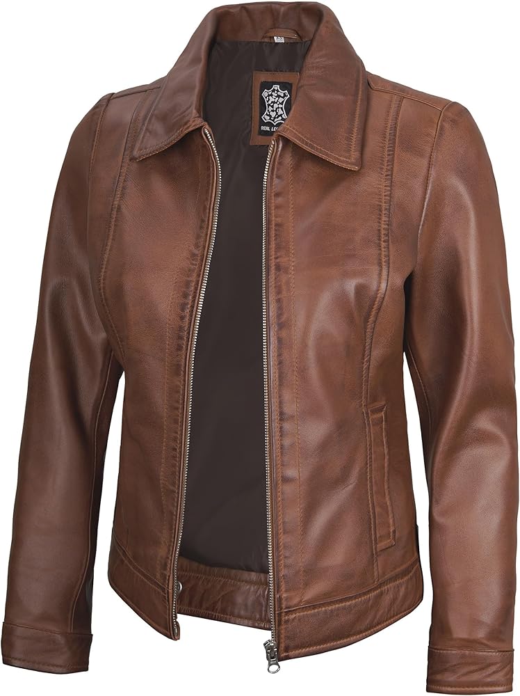 Elevate your everyday look with this classic brown leather jacket for women, crafted from 100% genuine lambskin for a buttery-soft feel and polished finish. Designed with a flattering silhouette, it features a secure front zip closure, shirt-style collar, and sleek seam detailing for a clean, modern appearance. The soft polyester lining ensures all-day comfort whether worn over a tee or sweater. This jacket is enough for spring or fall and layers effortlessly in colder weather. Whether you're heading out for a coffee run or dressing up for dinner, this versatile piece adds understated edge to any outfit. Fit Note: Runs slightly small — consider sizing up if layering or between sizes.