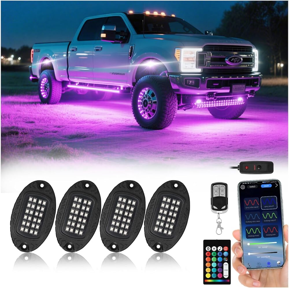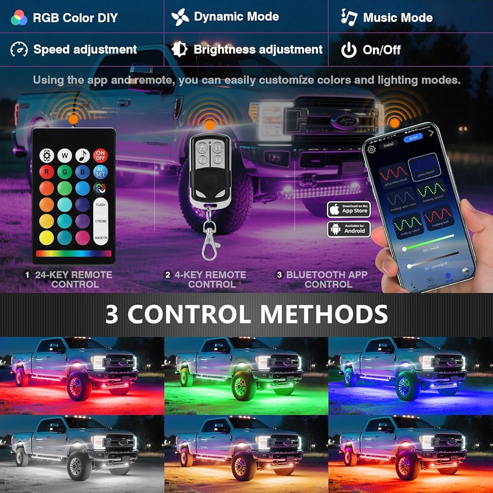 3 CONTROL METHODS: Our rock lights for trucks with bluetooth APP control, 24 keys remote, 4 keys keychain remote.Compatible with both Android and iPhone. You can turn the lights on and off, arbitrarily adjust the speed, brightness, blinking, breathing effect, color switching, red brake and other functions by remote, millions of colors are available to choose. And the APP has the functions of music synchronization, voice control, dimming brightness, timer setting, shaking color change, etc.