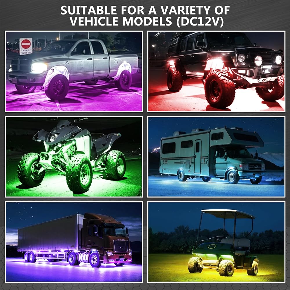 EASY TO INSTALL: The truck rock light kit is easy to install. We provide all the accessories needed to install LED rock lights, including 4 76.3-inch extension cables, allowing you to place RGB rock lights at greater distances to accommodate various cars. Equipped with self tapping screws, zippers, heat shrink wire connectors, fuses, etc. Suitable for all vehicles, including trucks, off-road golf carts, SUVs, ATV, UTV, RZR truck accessories, as well as 12V DC power supply