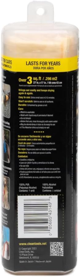 Made of a unique material called PVA (Poly Vinyl Alcohol), The Absorber is vastly superior to a terrycloth towel and leather chamois. A uniform, sponge-like pore structure enhances absorbency, giving The Absorber drying capabilities no other product can match. While The Absorber is unmatched as the best drying tool for cars and automobiles on the market, but it also can be used around the home or wherever life takes you on the go. With proper care, The Absorber lasts for years and can be stored moist and ready to use its handy tube.