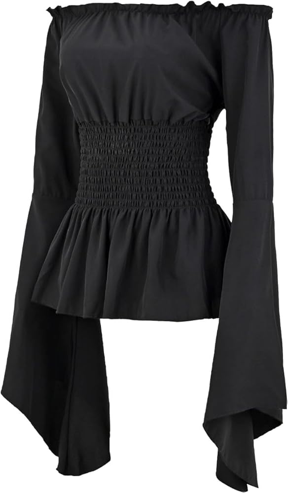 Feature:Sexy corset style gothic top can be worn as long bell sleeves, Lace ruffle neck and cuffs,Elastic high smocked waist,Elastic elbow design.Neckline with elastic band.The sexy cute strapless tunic shirt matches well with shorts, jeans and leggings.