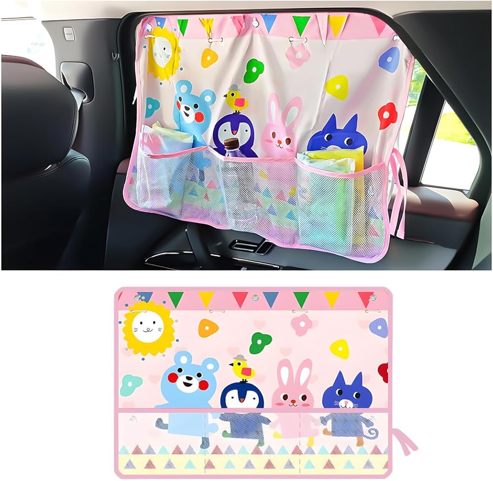 Cute Appearance: This car sunshade is designed with cute cartoon pattern, made of polyester cotton printing, washable and colorfast, the cute pattern can attract children's attention, give them intimate protection and care, and make their journey more enjoyable. It also comes with a mesh organizer bag for bottles, small toys and other small items. Great for use when traveling with kids.