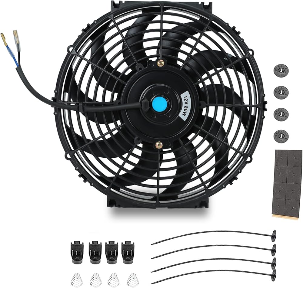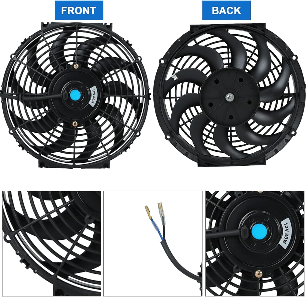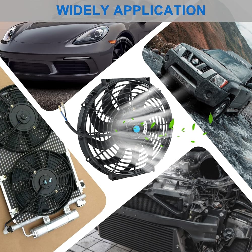 APPLICATION:Universal radiator cooling fan fit various vehicles and engines. It depends on the size of your radiator. Auxiliary equipment for cooling the entire engine compartment, including radiators, air.