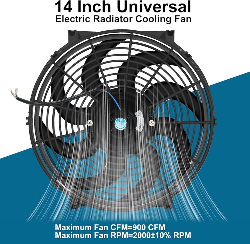 HIGH-PERFORMANCE: 12V 90W 14 Inch radiator engine cooling fan with mount brackets and tie straps kit. Maximum Fan CFM=1750 CFM, Maximum Fan RPM=2250 RPM.Number of Blades: 8.Thickness: 2.5 Inch