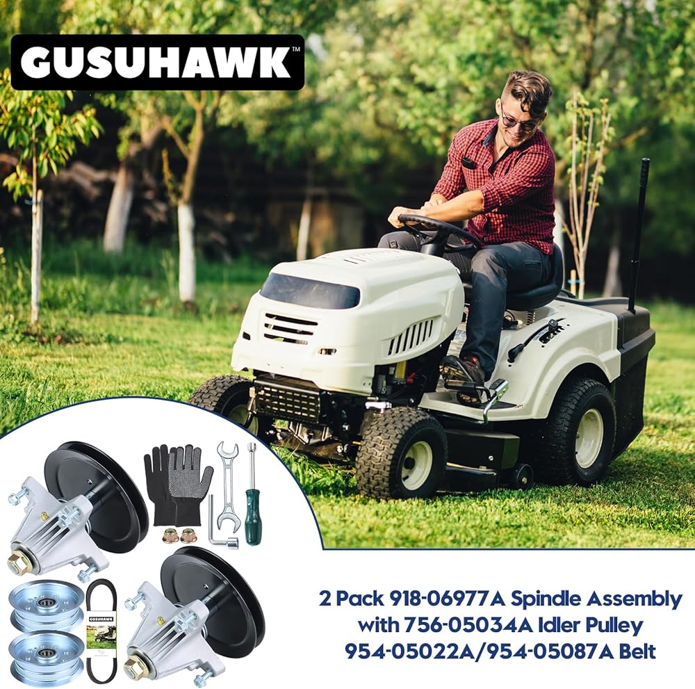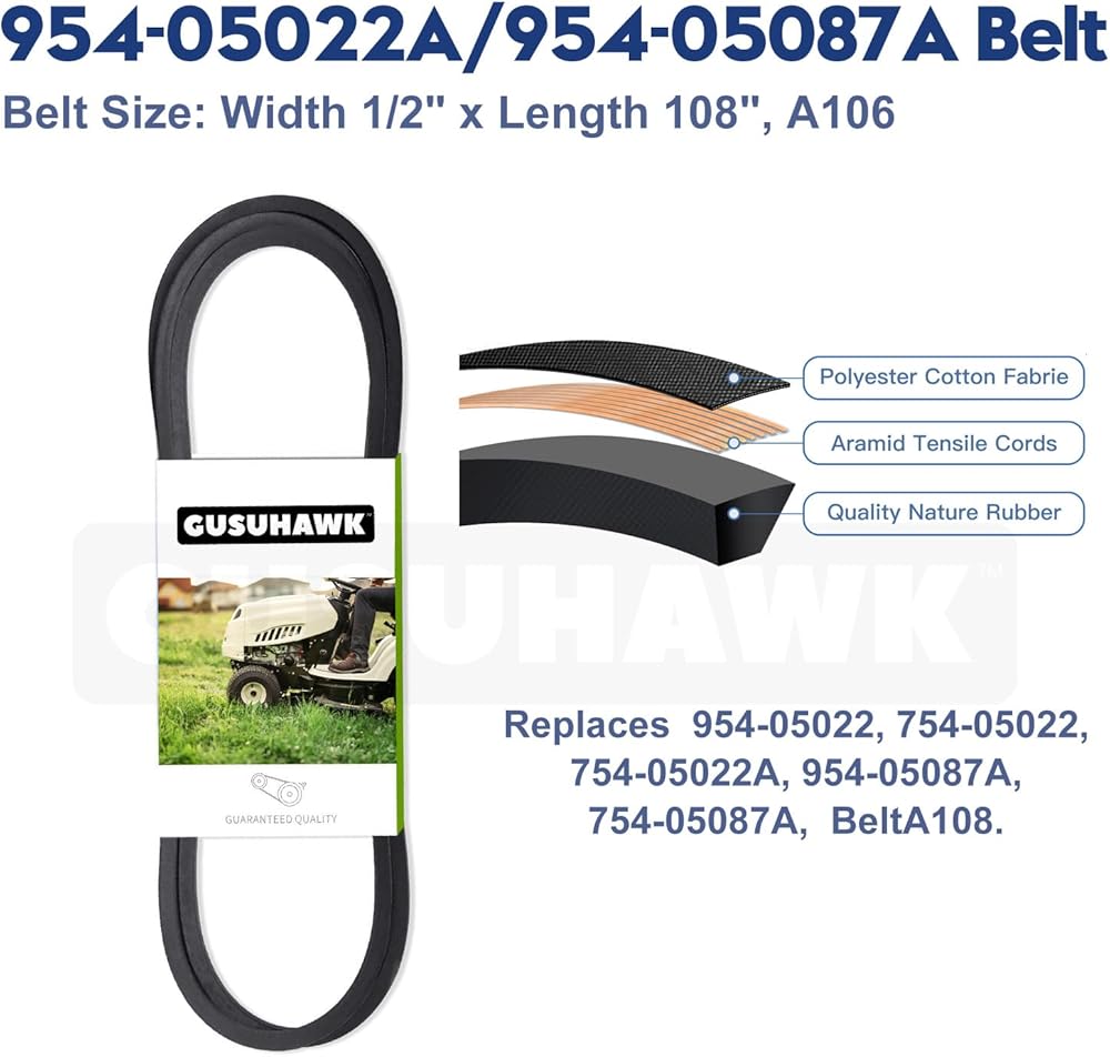 918-06977A Spindle Assembly Replaces Cub Cadet/ Craftsman/ MTD/ Troy Bilt 918-06977A, 918-06977, 618-06977A, 618-06977; 954-05022A V-Belt Replaces Troy Bilt/ Cub Cadet/ MTD/ Craftsman 954-05022A, 954-05022, 754-05022, 754-05022A, 954-05087A, 954-05087, 754-05087A, 754-05087; Specification: Width: 1/2 inch, Length: 108 inch(A106)