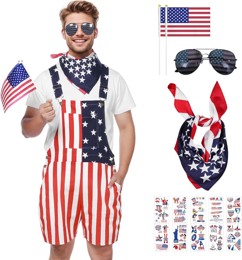 [USA Flag Overalls Set]: Our American flag overalls set includes 1 casual American flag bib pants, 1 American flag bandana, 2 14*21cm hand-waved flags with poles, 1 sunglasses and 10 tattoo stickers.
