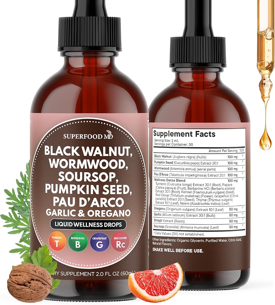 Men And Womens Green Black Walnut Wormwood Complex Liquid Droppers - Packed with minerals and herbs like garlic powder, black walnut tincture, pumpkin seeds organic, oil of oregano