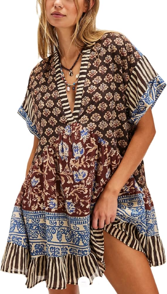 Design: This graphic beach mini dress adopts deep v neck, short sleeve, floral patchwork, ruffle hem, swing and flowy, a line dress, loose causal and vacation styled design, which makes you look pretty and eye-catching