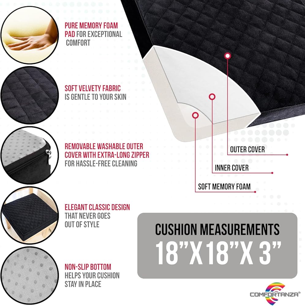 LONG-LASTING COMFORT - You'll love the stylish quilted design and the soft feeling of velvety fabric combined with soft pure memory foam. Sitting on our thick seat cushions is not only very comfortable but also relieves pain and eliminates the discomfort associated with prolonged sitting on hard chairs. Make sitting on your wooden kitchen and dining chairs more comfortable, add softness to your favorite recliner or armchair.