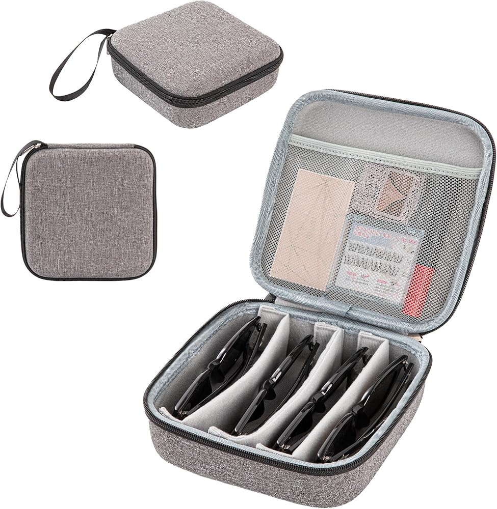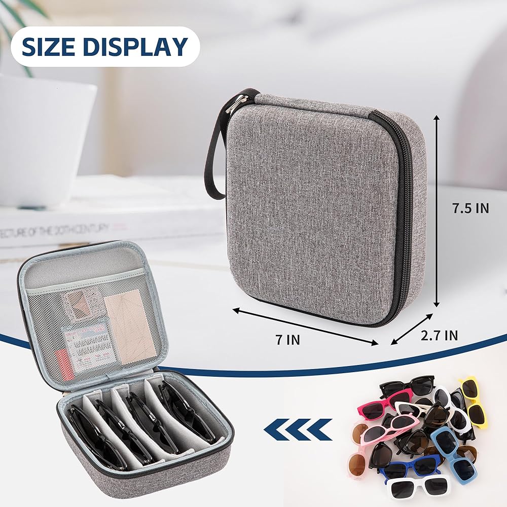 Adjustable storage slots: You can manually adjust the interval between sunglasses storage organizer, and customize storage tanks suitable for various glasses sizes, which can accommodate up to 4 pairs of glasses, which is convenient for flexible organization. The size of the glasses storage box is 7.5 inches x 7 inches x 2.7 inches, which provides a perfect and fashionable solution for carrying sunglasses out.