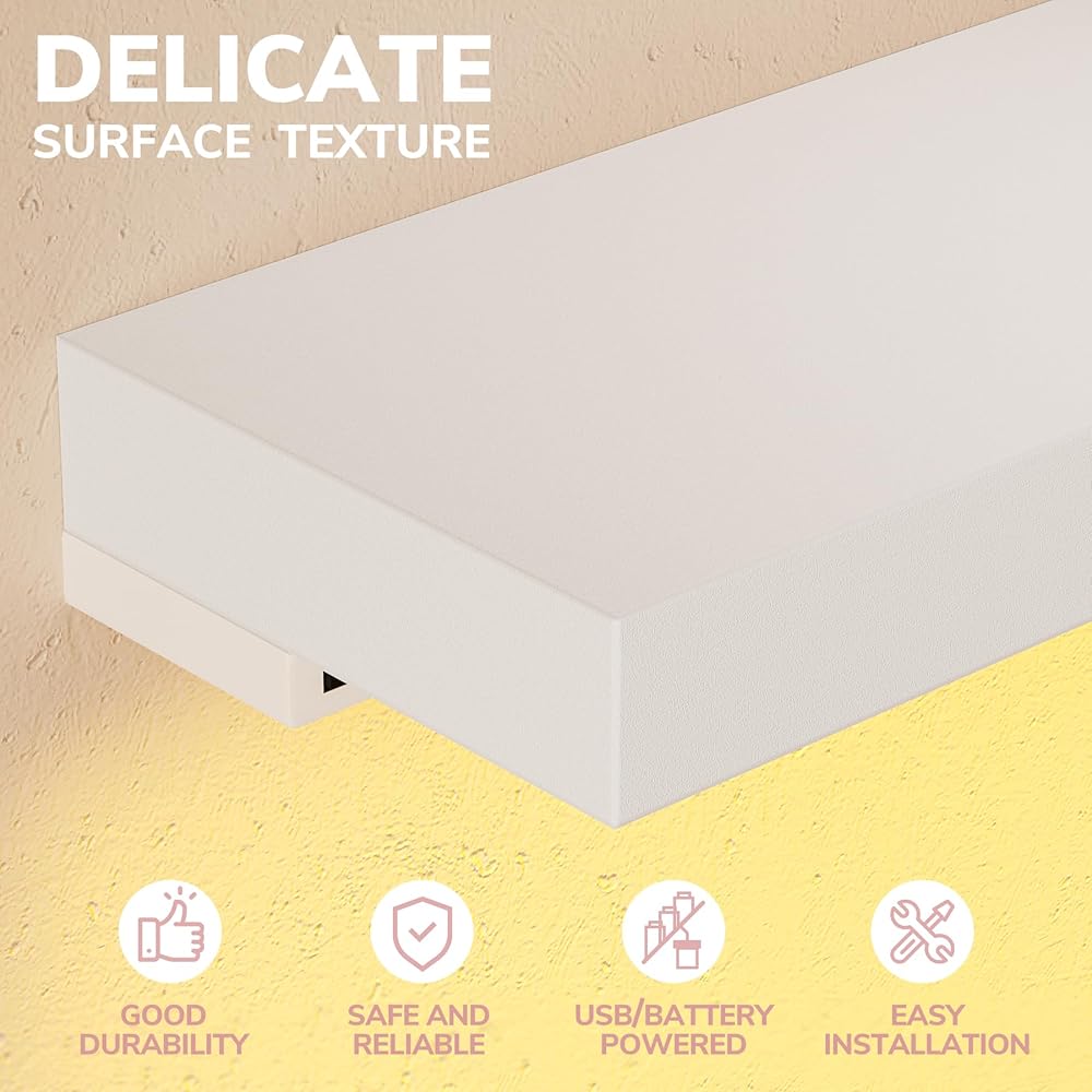 Convenient Dual-Power LED Lighting: Our wall shelves can be powered by either three AA batteries (not included) or a USB connection. The battery box can be securely mounted to the shelf using the provided 3M tape adhesive, offering a versatile lighting solution for any room. Enjoy the flexibility to light up your space without the worry of finding a power outlet nearby. Please note:Batteries are not included with the purchase.