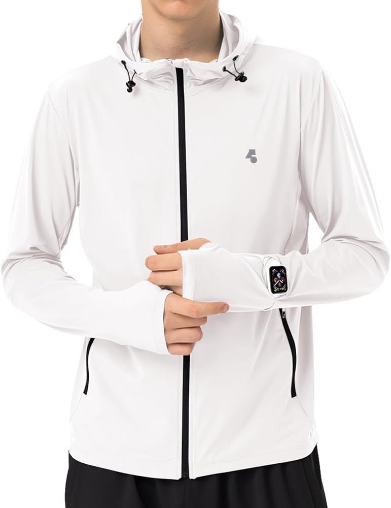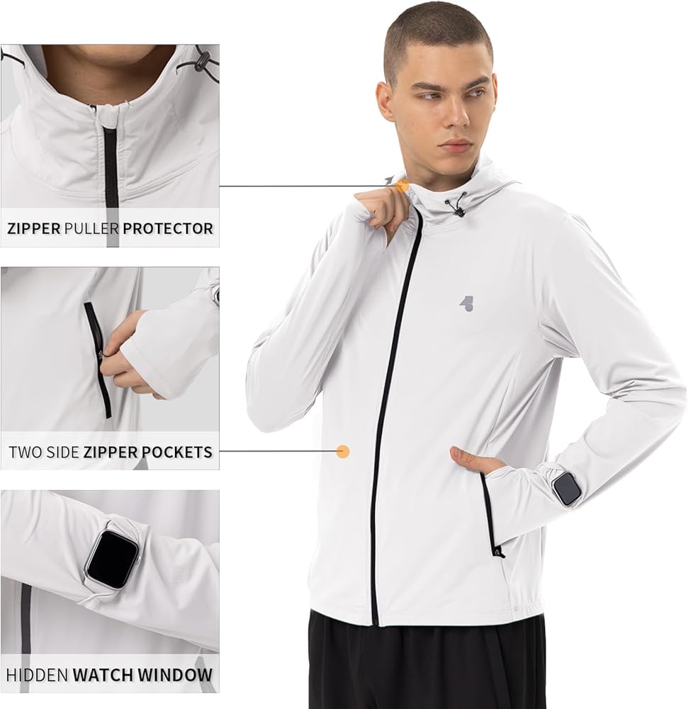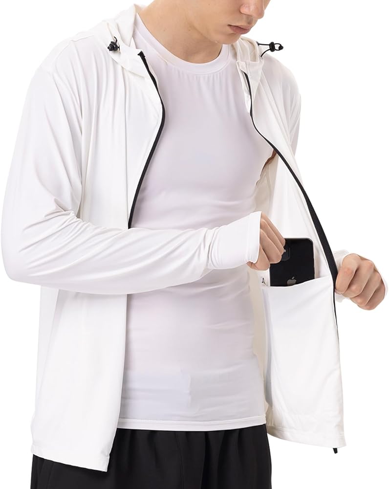 Lightweight,only 0.75 lbs.Easy to pack with two full zipper pockets, full zip hooded track jacket for men.Recommended for lounging, walking the dog, gardening,traveling, do sports,also be used as a uv rash guard in the sun or on the pool/beach for mens,young man and big boys