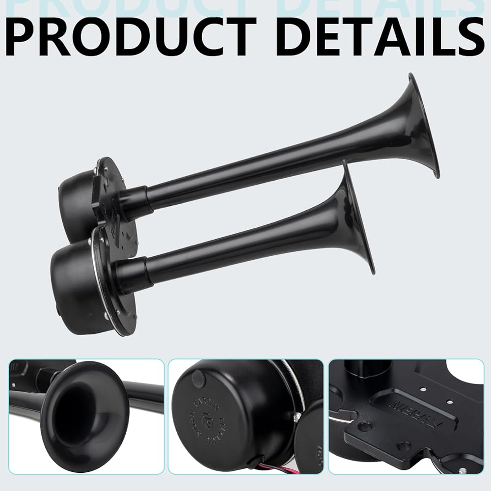 Black Electric Horn kit for Motorcycle, 150dB Waterproof Train Horn for Truck, Auto Horns Kit Universal for Any 12V Vehicles, Replacement for Truck/SUV/Van/Car/Motorcycle/ATV/Golf Cart Horns
