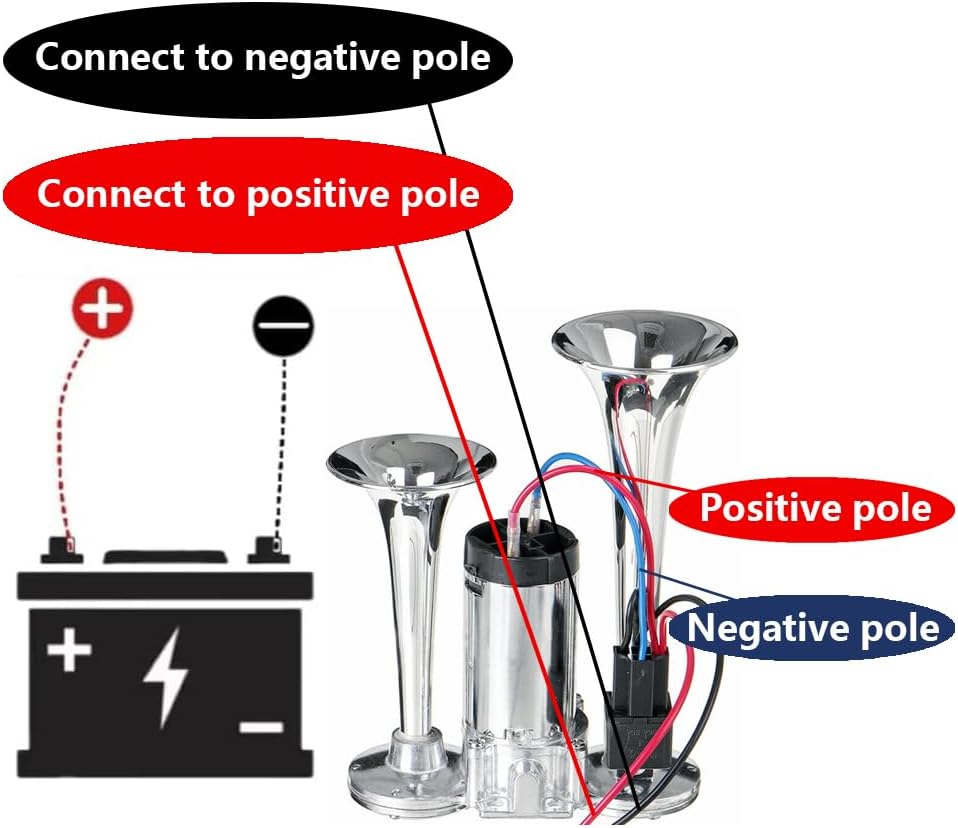 Easy to Install: Our horn kit is very easy to install, you just need to connect the horn wire on the car and the two wires of the air horn, and it will work properly, from positive pole to positive pole, from negative pole to negative pole. It also comes with a universal bracket, making installation easier.