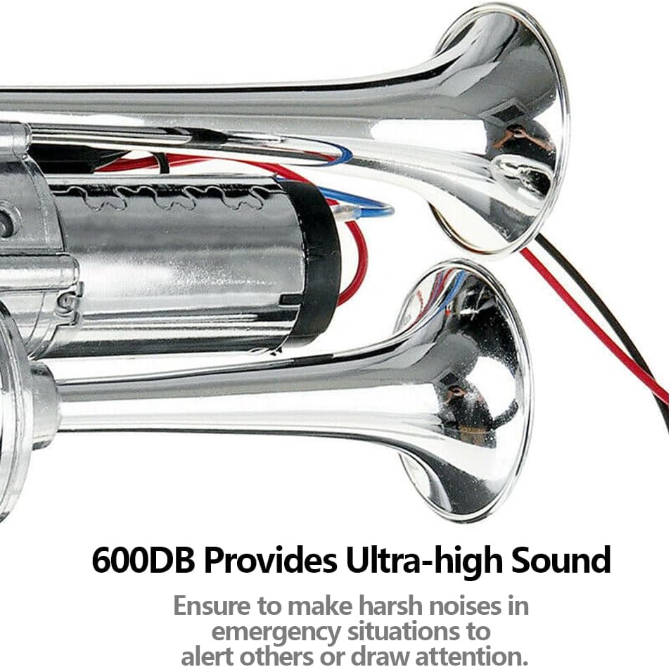 600DB Super Loud: The upgraded air compressor and larger coil of the dual tube air horn can create stronger air pressure, resulting in a louder and clearer sound from the horn, with a sound level of 600DB.
