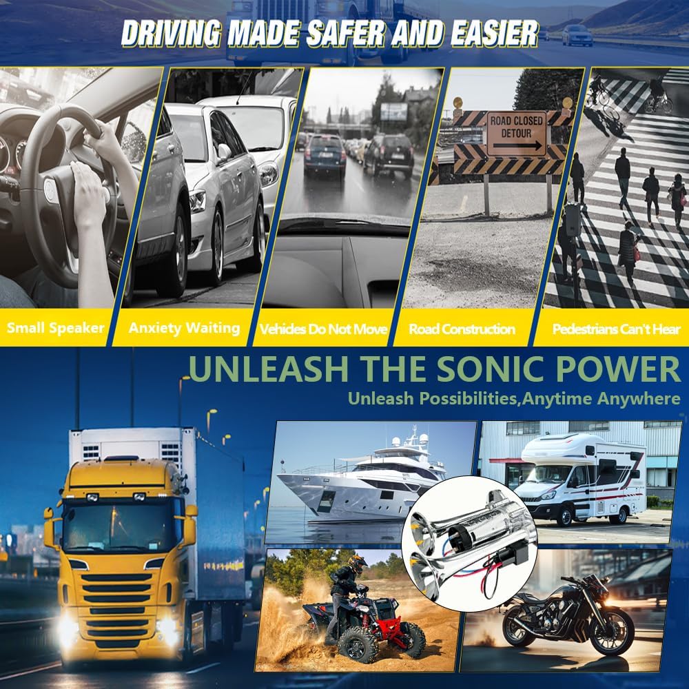 Universality: The air horn is suitable for all 12V vehicles and is suitable for most SUVs, motorcycles, yachts, ships, off-road vehicles, buses, trains, etc.