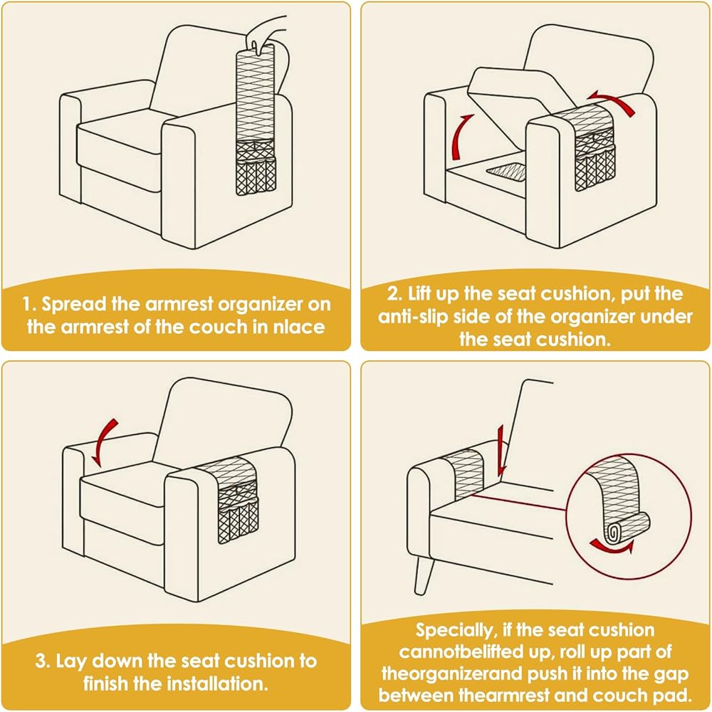 【Easy Installation & Versatile Use】Installing this over the arm chair caddy is a breeze—simply tuck it under the sofa cushion and adjust as needed. The excess can be rolled up and placed under the seat for a snug fit. Arm chair caddy for recliners is ideal for sofas, recliners, and even beds, making it a versatile recliner side pocket storage solution.