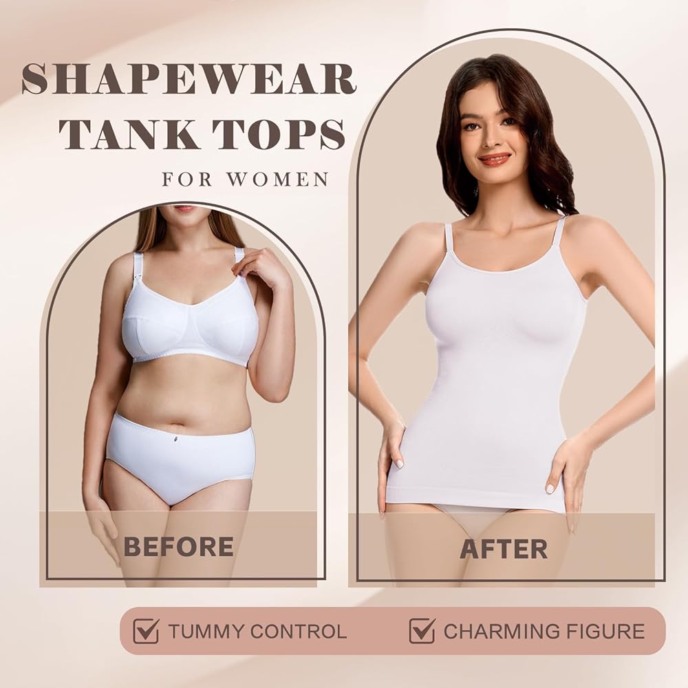 Comfortable & Seamless Camisole Tops:This body shaper compression top is made of 90% Nylon and 10% Spandex,skin-friendly and breathable.Our women's shapewear camisole is stretchy enough to move with your body,but firm enough to maintain its shaping effects.Seamless design of the shapewear tank for women tummy control makes it invisible under clothes,so no one will know the secret behind your charming figure.