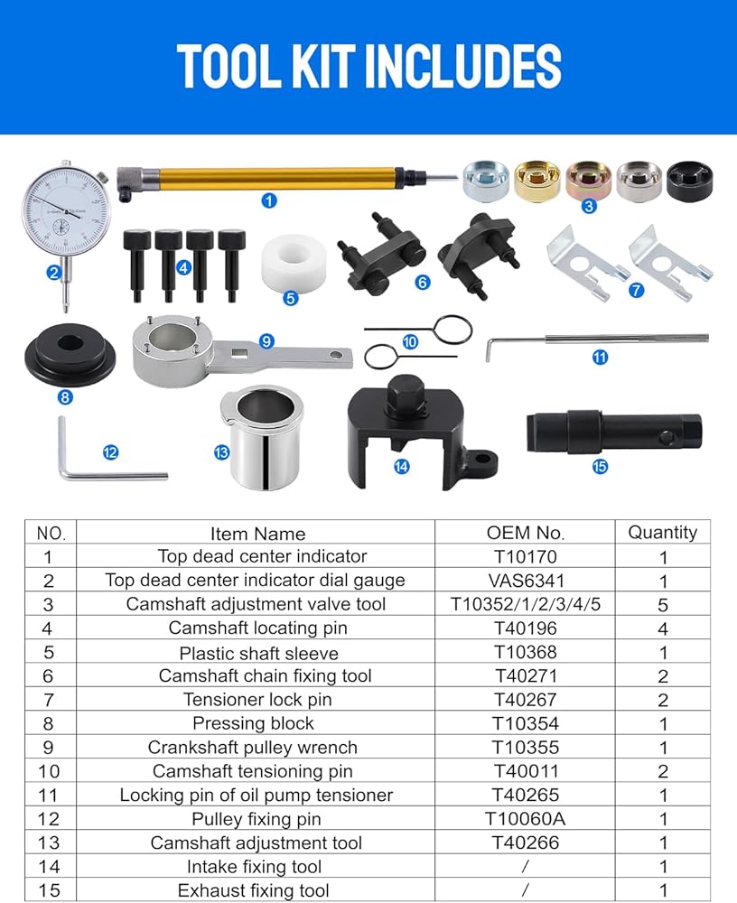 Package List: Camshaft adjustment valve tool * 5; Plastic shaft sleeve; Camshaft locating pin * 4; Camshaft chain fixing tool * 2; Tensioner lock pin * 2; Pressing block; Crankshaft pulley wrench; Camshaft tensioning pin * 2; Locking pin of oil pump tensioner; Pulley fixing pin; Camshaft adjustment tool