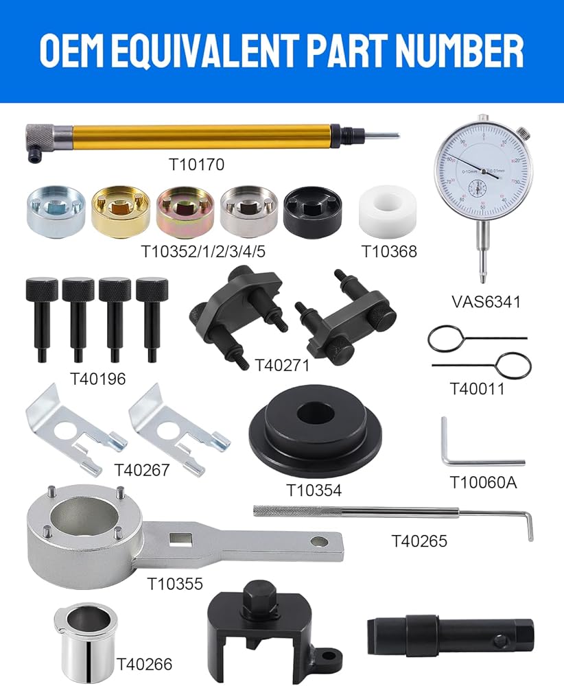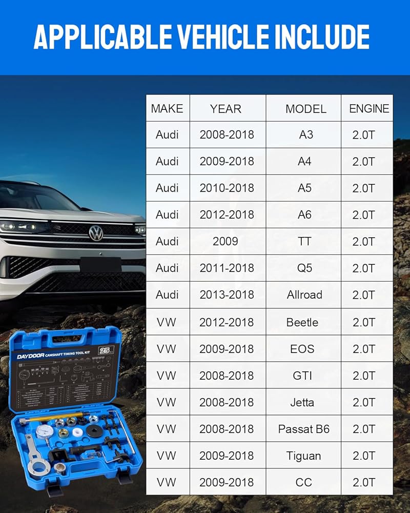 Applicable to: The 21 pcs camshaft timing tool kit fits for 2006-2018 TSI TFSI EA888 1.8 2.0 engine. Compatible with most Audi A3 A4 A5 A6 Q5 TT/TT Quattro 2.0T, for VW Jetta Mk5, VW Jetta Mk6, VW Passat B6, VW CC, VW Scirocco, VW Golf Mk6 GTI