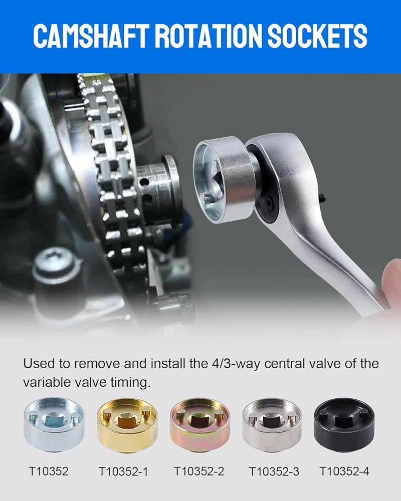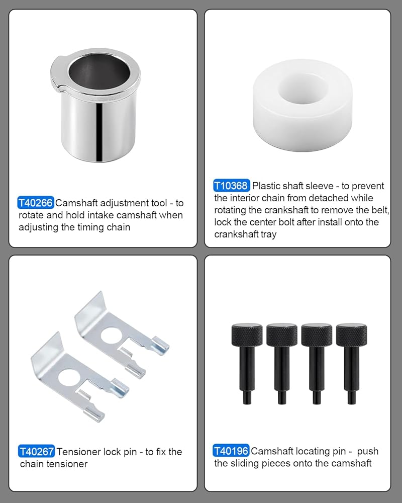 For the Professional Engine Repair: Ideal for correcting the timing position of the camshaft and crankshaft. The Camshaft adjustment tool is used to rotate and hold intake camshaft when adjusting the timing chain. The Camshaft pulley fixing tools are specially designed to fix the inlet camshaft and outlet camshaft pulley. All parts are made of premium steel for long time use