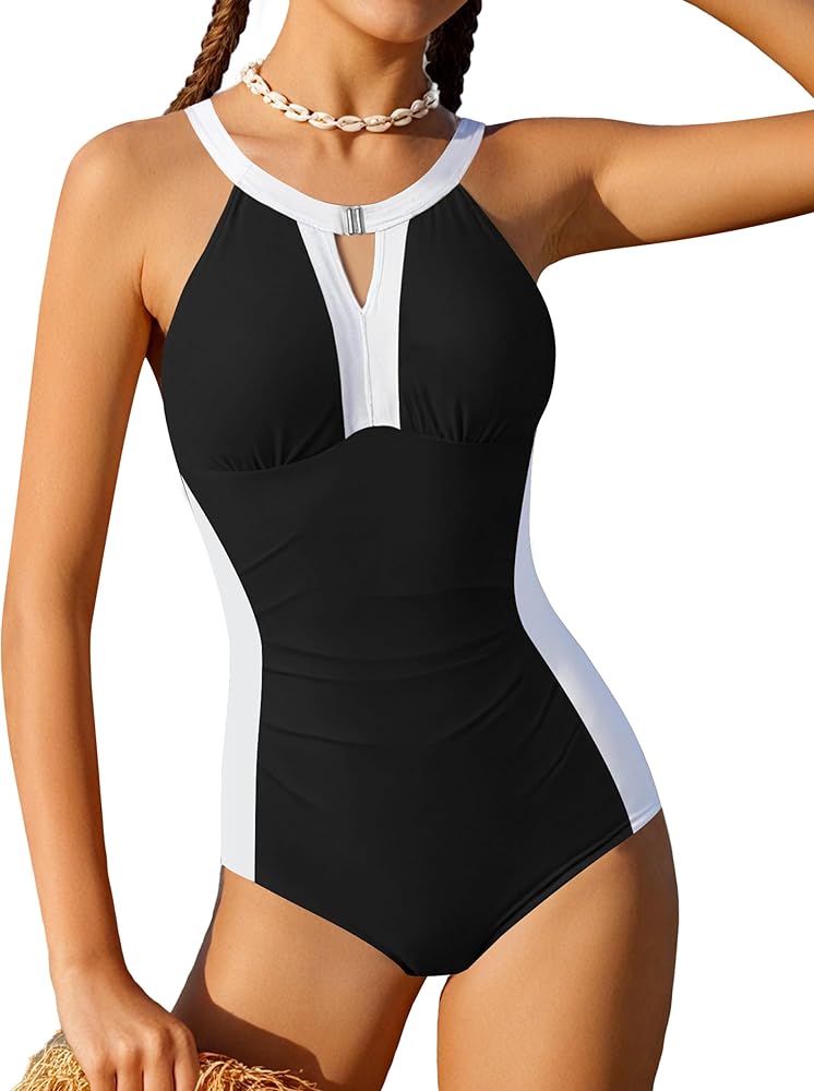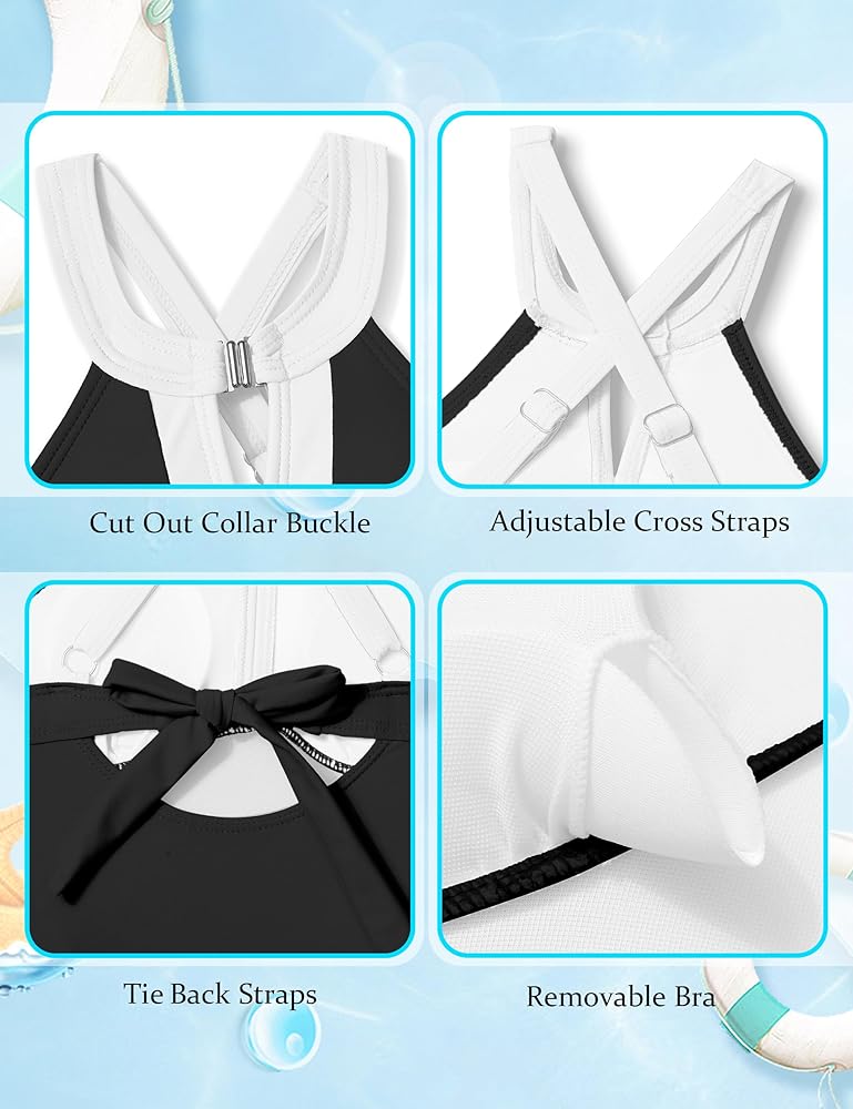 🩱【Stylish Design】: Girls swimsuits features tummy control and unique retro color-block design, which is flattering and provides visual slimming. High-neck cutout is chic and eye-catching. Silver clasps can open easily, making it more convenient to put on. The adjustable cross-back and tie-back design blend playful and cute elements with practical functionality. These modest yet stylish designs make our bathing suit a versatile choice for this summer!