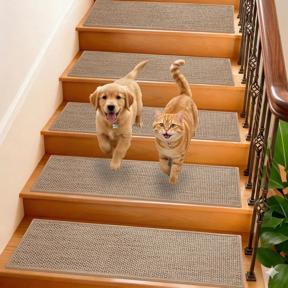 PROTECT YOUR FAMILY FROM SLIPS - Our stair carpet is made with linen surface and self-adhesive non-slip backing, featuring a dual-sided slip-resistant design. Whether you're walking barefoot, wearing shoes, or socks, it provides excellent traction to maintain stability and prevent any slipping. GROWLING stair treads provide safety and peace of mind for your children, elderly parents, and pets.