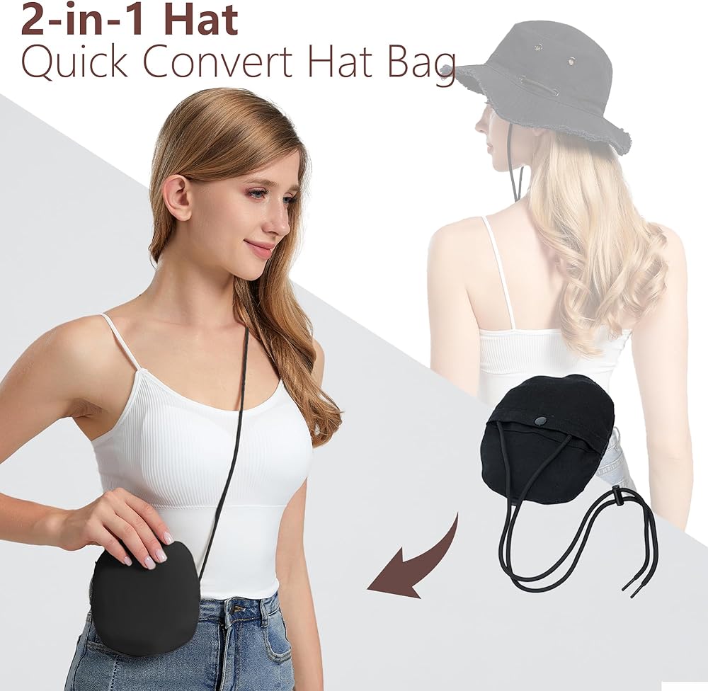 Lightweight and Portable: This boonie hat is not just a hat—it's a multi-functional accessory! When not in use, It can be easily folded into a compact crossbody bag, allowing you to carry easily. This innovative design makes it incredibly convenient for outdoor enthusiasts who need hands-free portability. Whether you're trekking up a mountain or strolling along the beach, this hat transforms into a stylish and practical carry-on