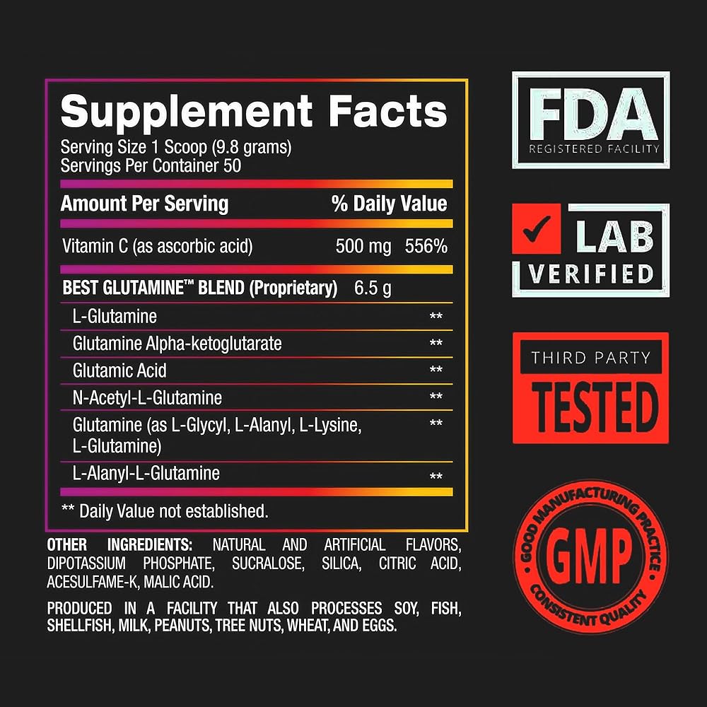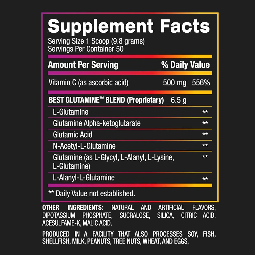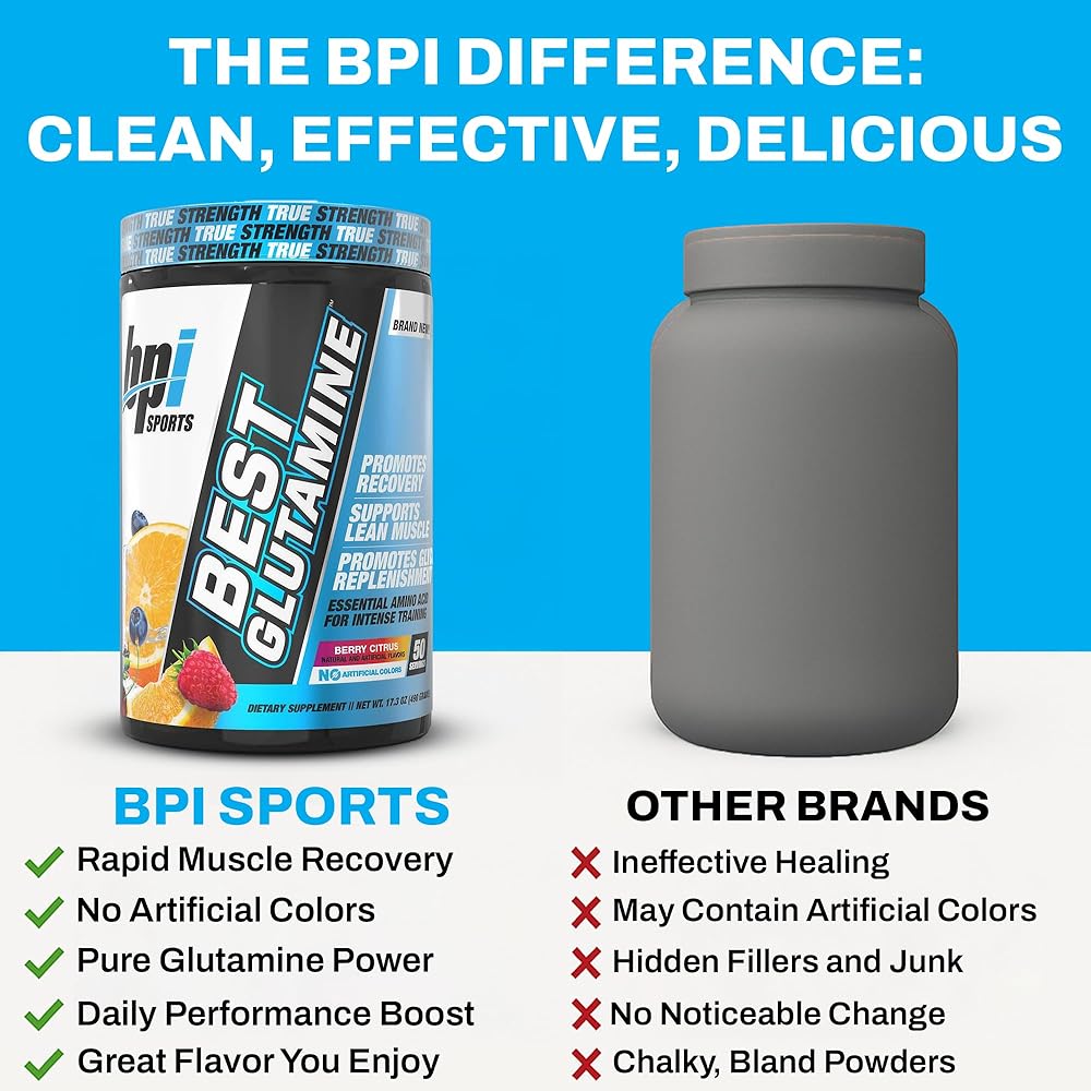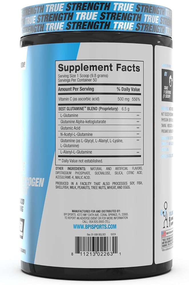 Fuel your recovery with BPI Sports Best Glutamine — a high-performance l glutamine powder designed to support muscle recovery, immune health, and digestive function. This advanced glutamine supplement delivers 6.5g per serving of six powerful glutamine forms, including L-Glutamine, Glutamine AKG, N-Acetyl-L-Glutamine, and L-Alanyl-L-Glutamine, giving your body what it needs to repair muscle and bounce back fast. Unlike standard l glutamine capsules, this fast-absorbing l-glutamine powder mixes easily and works quickly, making it ideal for pre workout, intra workout, or post workout recovery. Every scoop also packs 500mg of Vitamin C to support your immune system and overall health during intense training. Whether you're looking to reduce muscle soreness, improve endurance, or boost your recovery game, this l glutamine supplement helps you train harder and recover smarter. Perfect for men, women, athletes, and fitness enthusiasts who want more than just the basics.