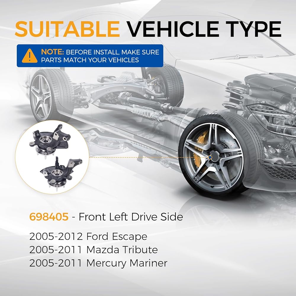 [Vehicle Fitment] 698405 Steering knuckle & wheel bearing hub assembly fit for 2005-2012 Ford Escape, 2005-2011 Mazda Tribute, 2005-2011 Mercury Mariner,located on front left drive side.