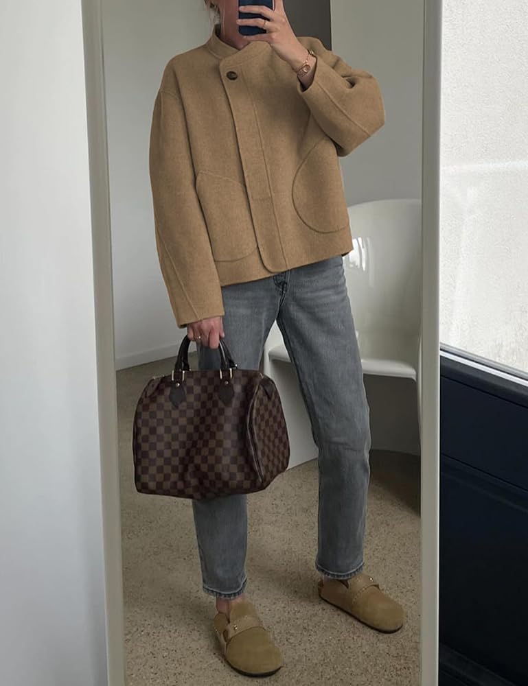 Oversized pea coat, loose fit, front round patch pockets, hidden button placket except for the tallest button, short, stand collar, long sleeves, double-faced fabric