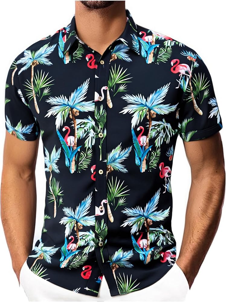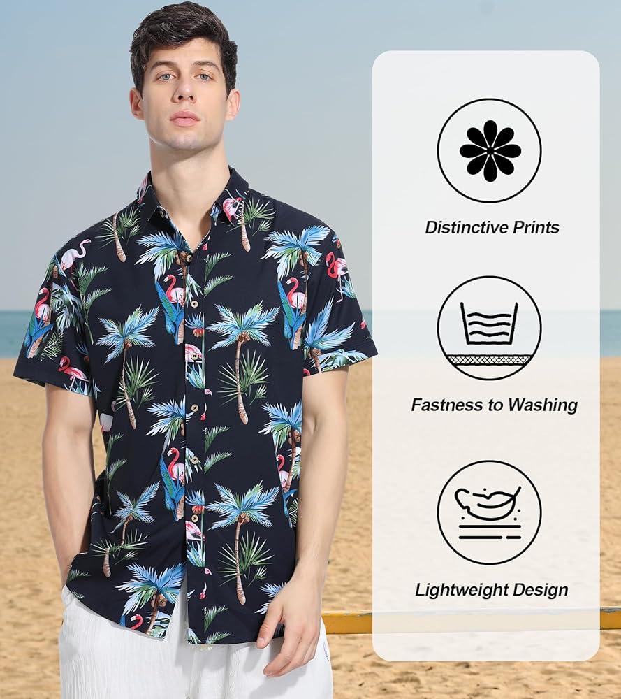 TROPICAL HAWAIIAN DESIGN:Mens hawaiian shirts, short sleeve casual button down style, camp collar, straight hem with side vents, regular fit men shirts, which looks very handsome and casual, fits true to size, out-of-office style, daily wear. You can also wear the hawaiian shirt with a t-shirt inside,you will be the eye-catcher. The mens summer shirts are perfect matched with shorts, beach pants etc