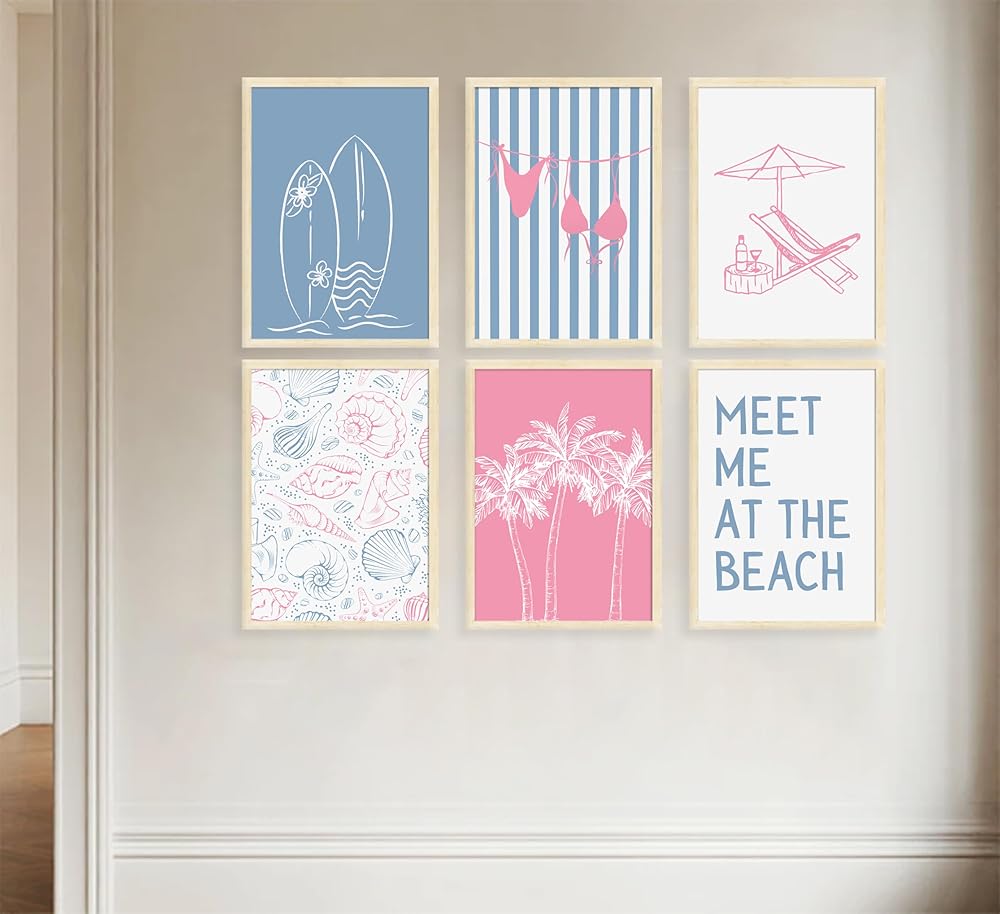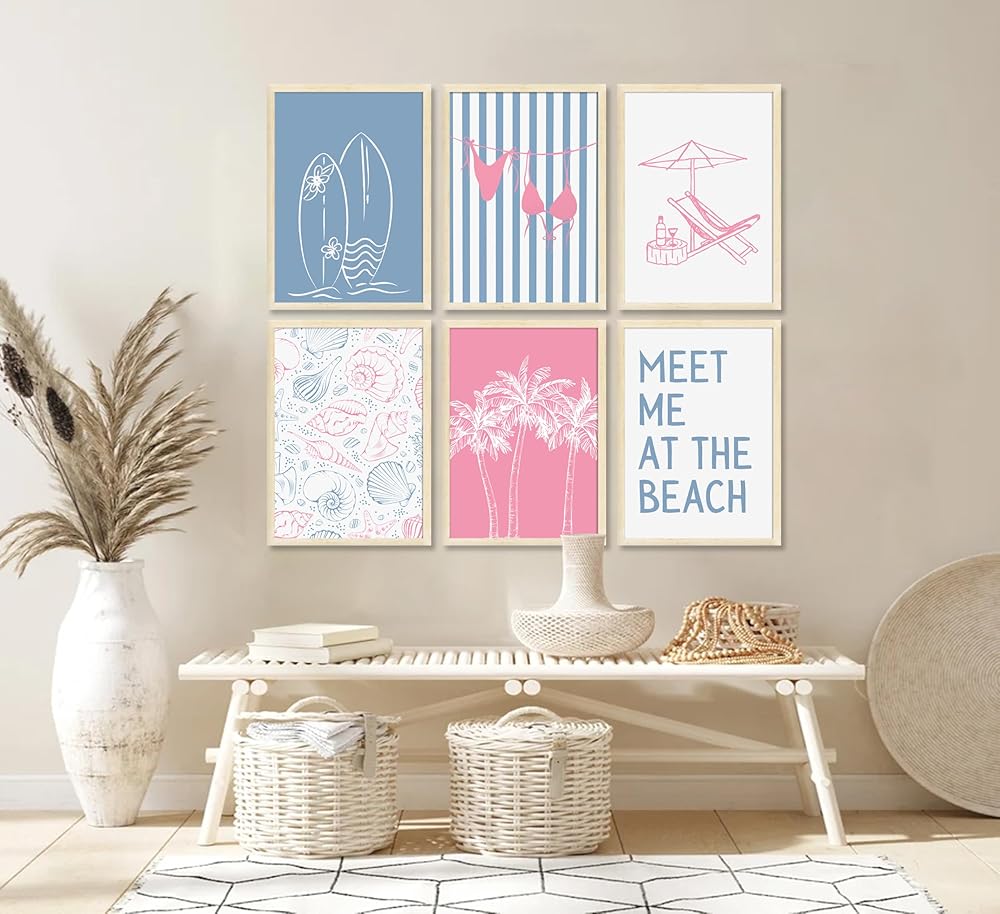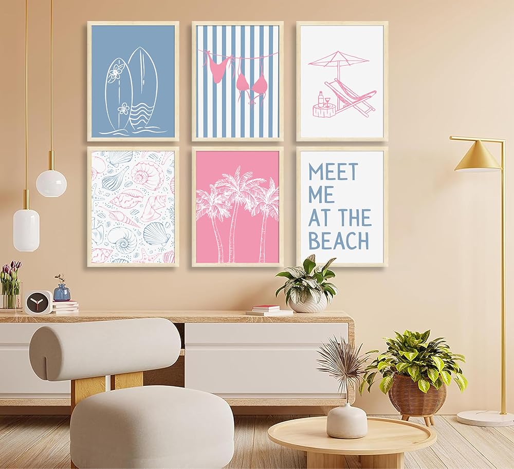 The Beach Print Preppy Gift :Meet me at thebeach Looking for a unique gift The Coastal Beach Surfing Wall Art is an excellent choice for beach lovers and can brighten up any home, making it a thoughtful present for friends and family. Transform your space with our 6Pcs Coastal Beach Surfing Wall Art, featuring vibrant preppy bikini and shell designs that perfectly capture the essence of summer.