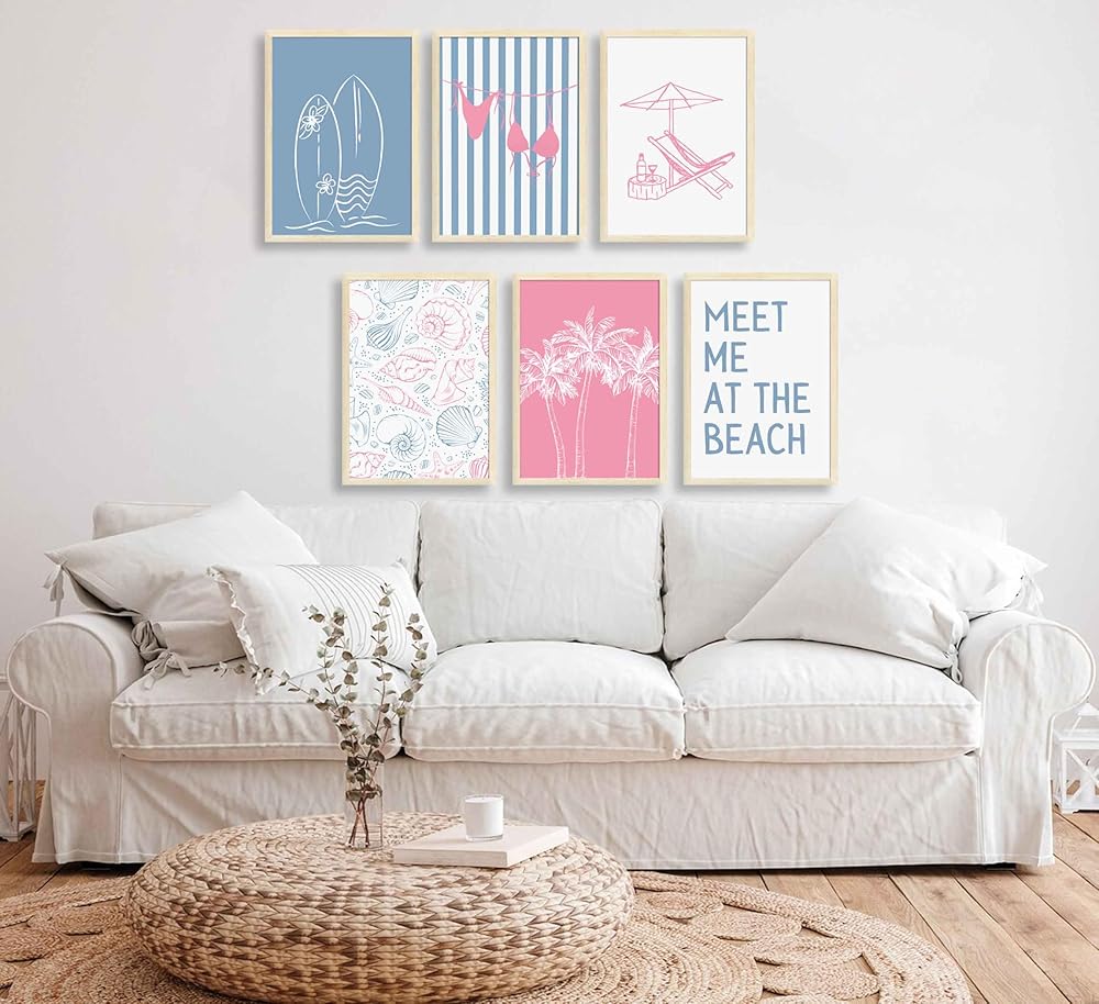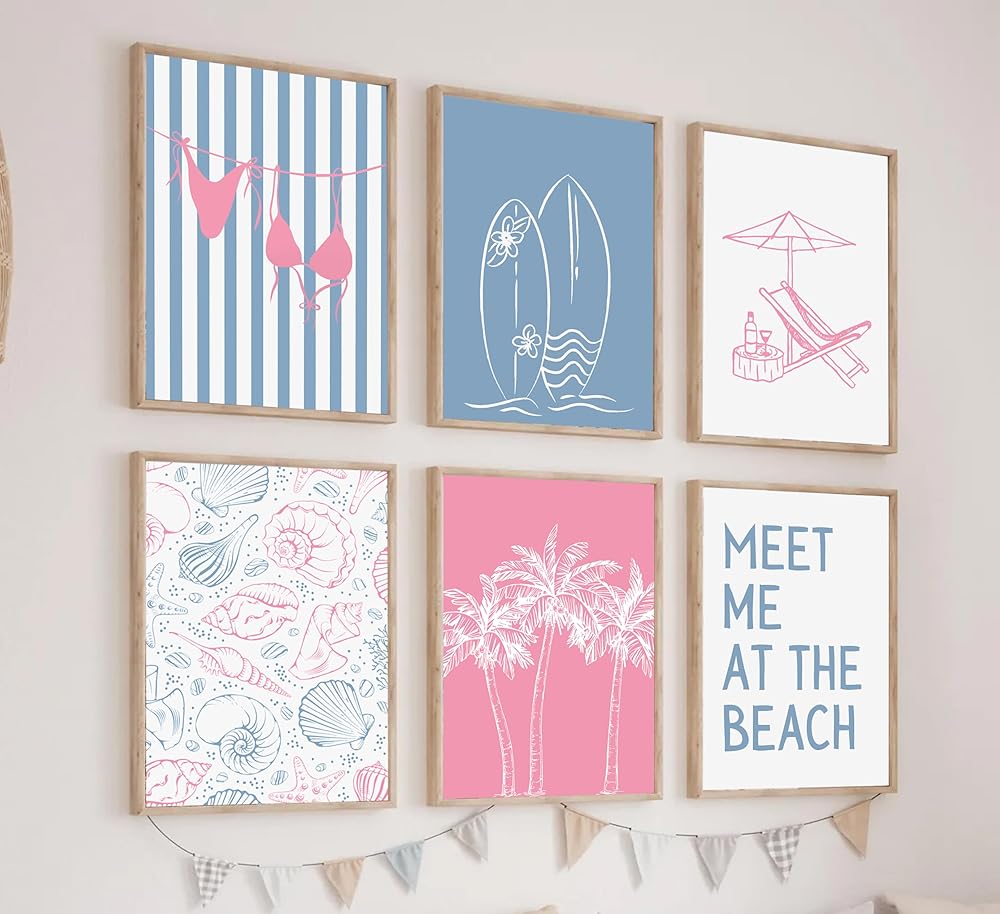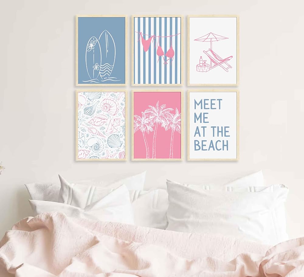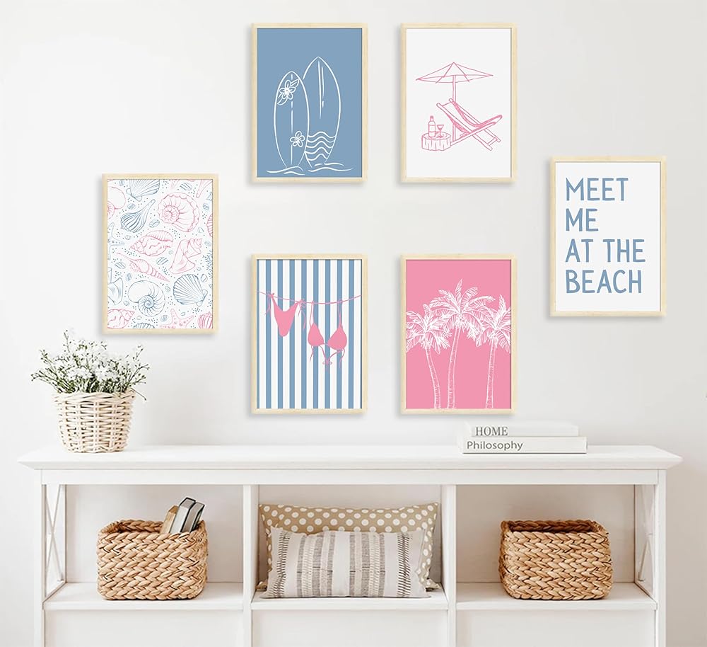 The Beach Print Preppy Gift :Meet me at thebeach Looking for a unique gift The Coastal Beach Surfing Wall Art is an excellent choice for beach lovers and can brighten up any home, making it a thoughtful present for friends and family. Transform your space with our 6Pcs Coastal Beach Surfing Wall Art, featuring vibrant preppy bikini and shell designs that perfectly capture the essence of summer.