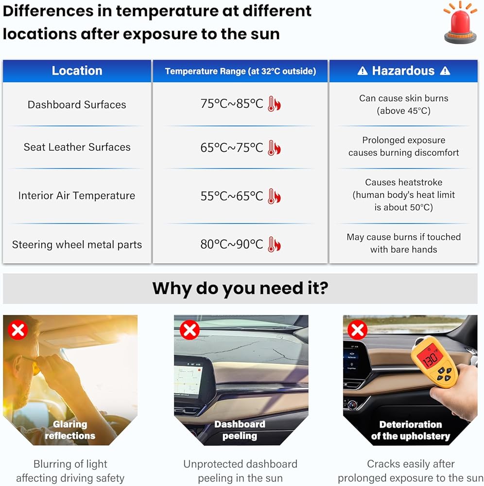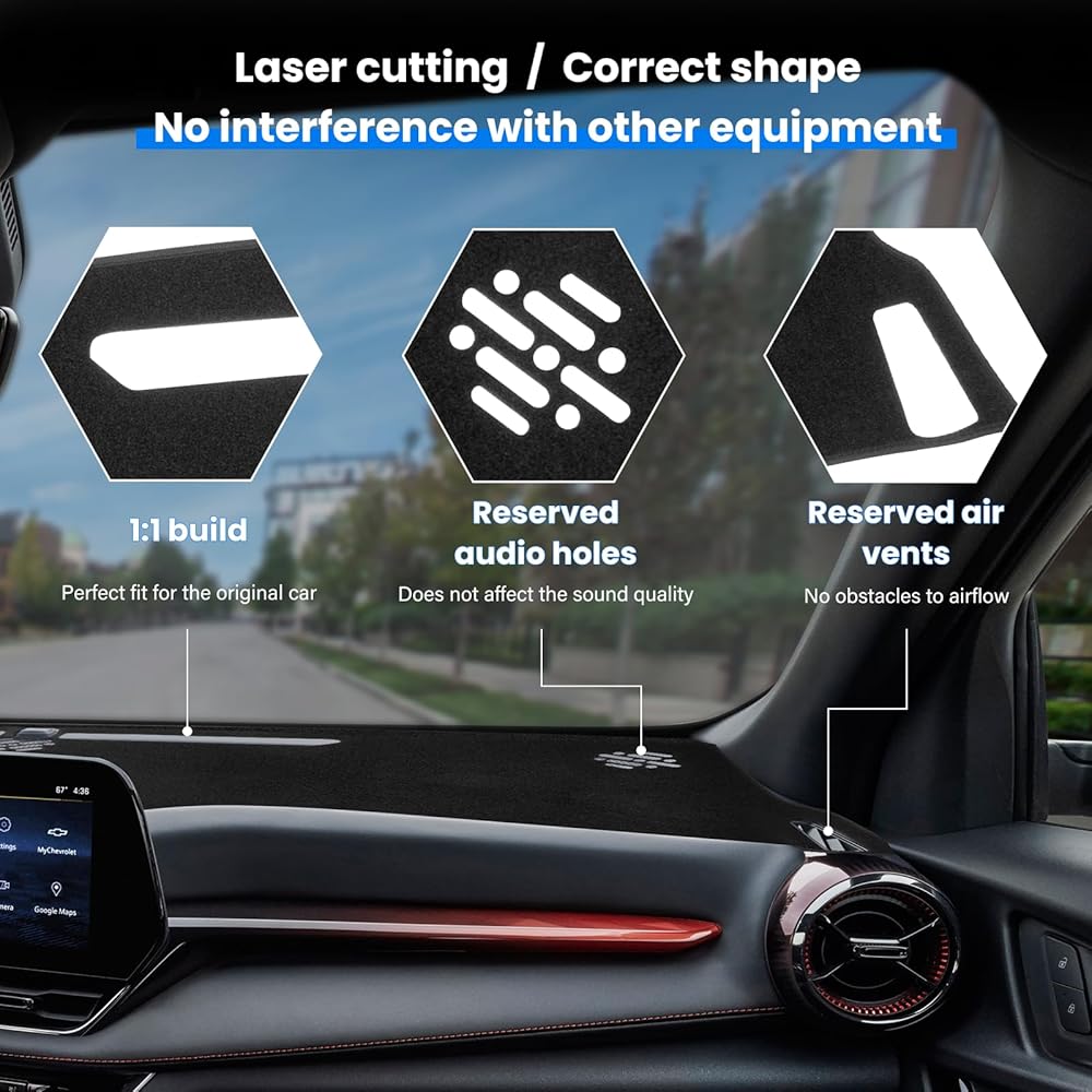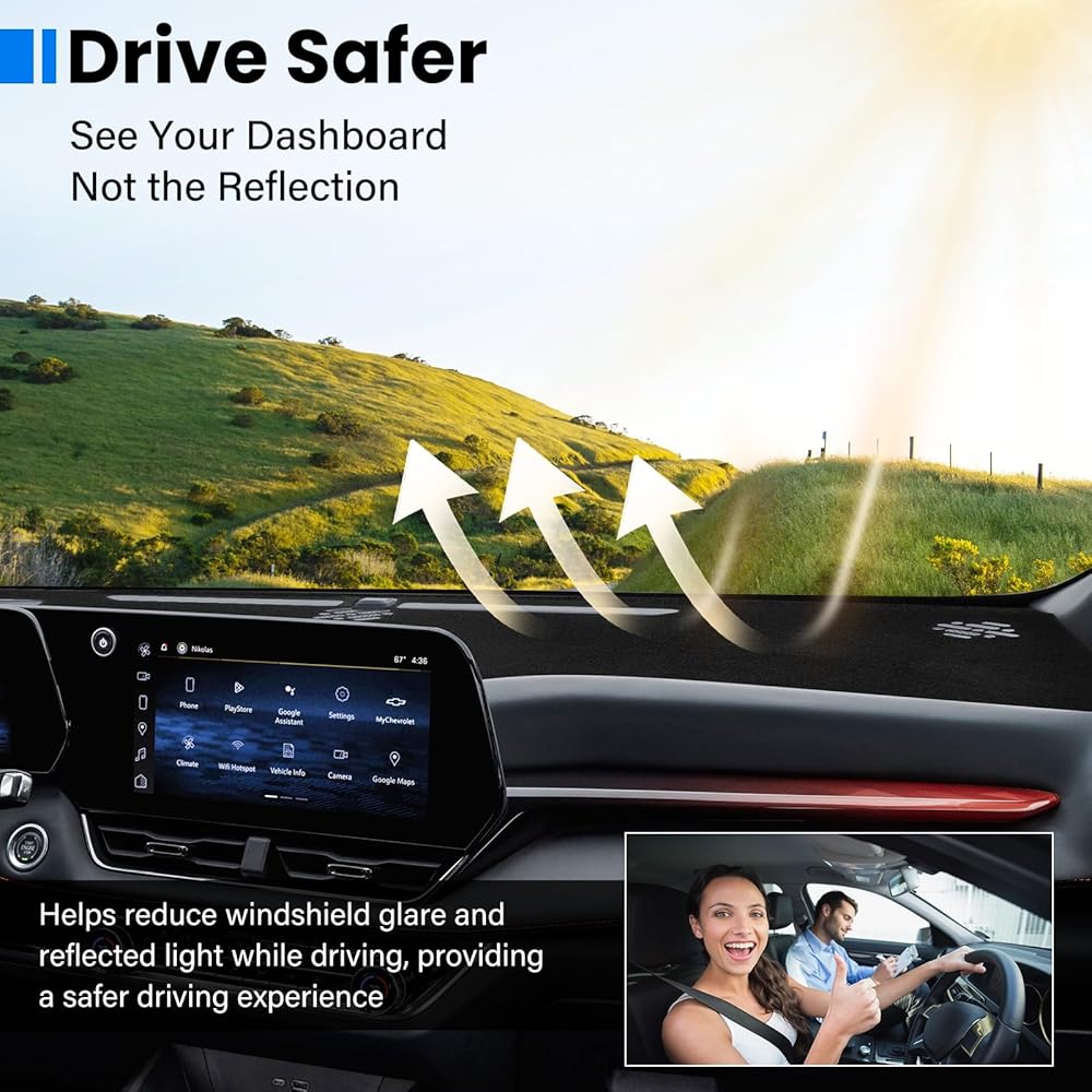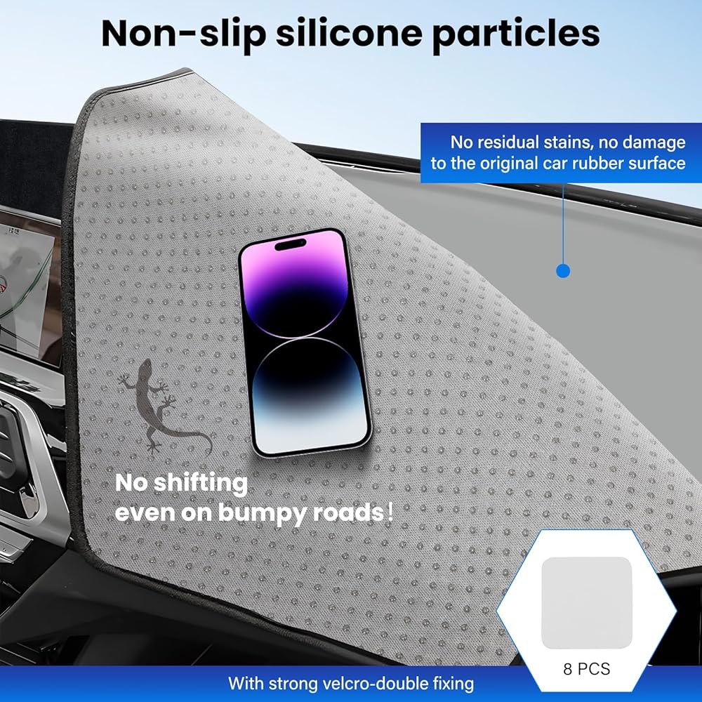 Perfect Fit & Anti-Slip Design:Our Dashboard Precision-cut for your specific car model,ensuring seamless coverage without wrinkles. The silicone-grip backing and Velcro strips prevent sliding, even on bumpy roads—no residue or adhesive damage