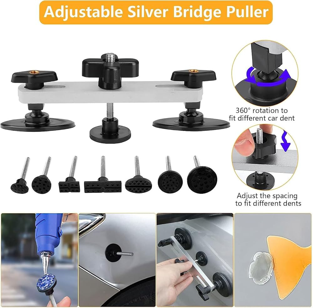 AINTLESS DENT REPAIR TOOL KIT: This is a professional paintless dent repair kit. The bottom of the dent removal tool is made of rubber and will not damage the original paint. The car body dent puller pulls car dents through the stickiness of the hot melt adhesive without damaging the car paint. Tips: If your paint is damaged before the dent is repaired, we do not recommend this car dent repair kit.