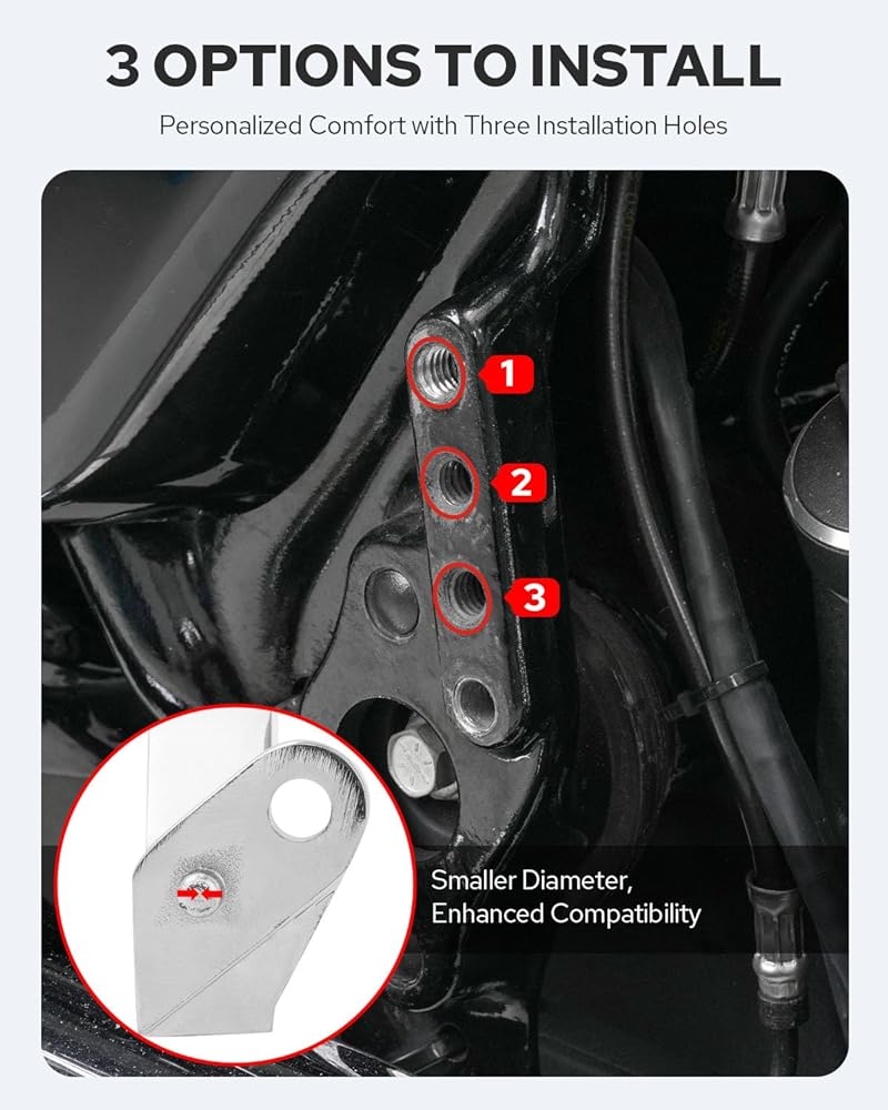 3 Options to Install. Benlari passenger foot pegs can be installed in the three front mounting holes on your vehicle, giving you more options to customize for comfort. The smaller footrest posts make installation easier and improve the fit