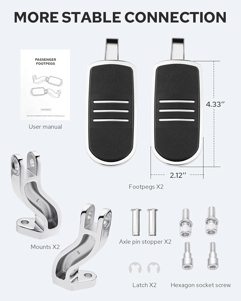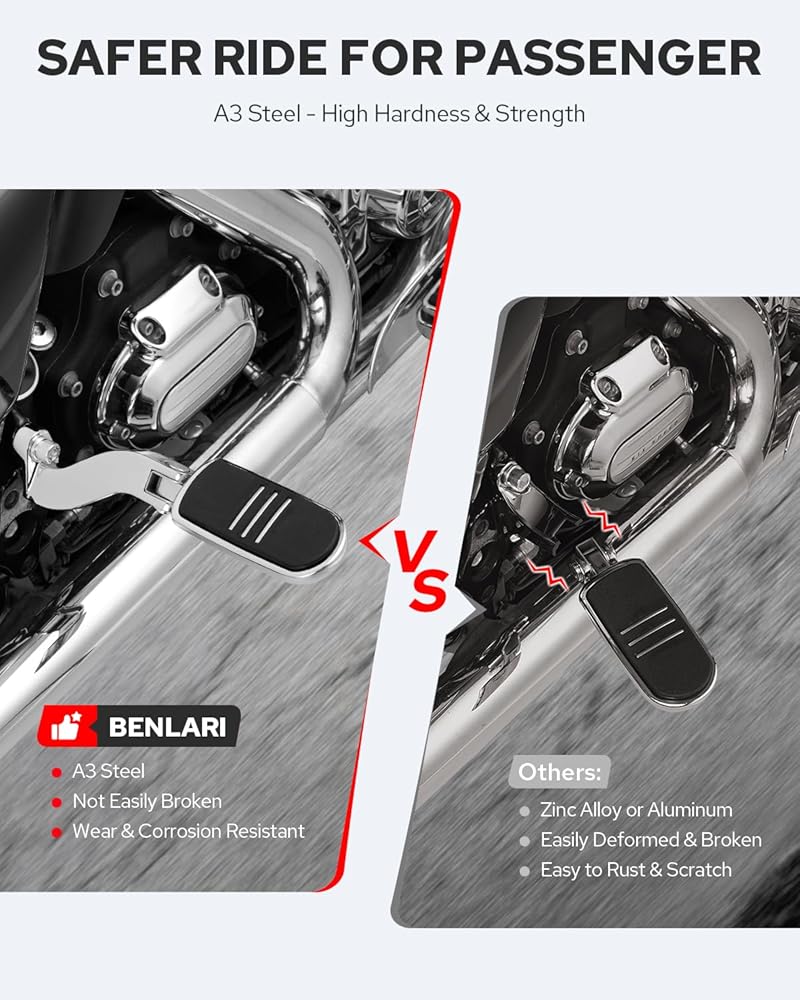 Safer Ride For Passenger. Benlari rear passenger foot pegs mount kit is made of high hardness A3 steel, which is wear&corrosion-resistant and not easy to deform and break. Using thickened and anti-slip rubber to offer passenger a safer ride