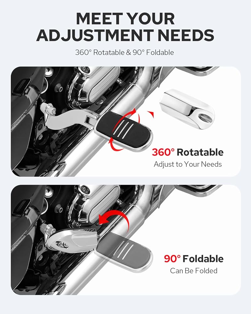 Meet Your Adjustment Needs. Benlari passenger footpegs can 360° rotation, it's convenient for you to adjust the angle according to your need. 90° foldable allows to retract the footpeg by folding it upward 90°, so you can storage them when not in use