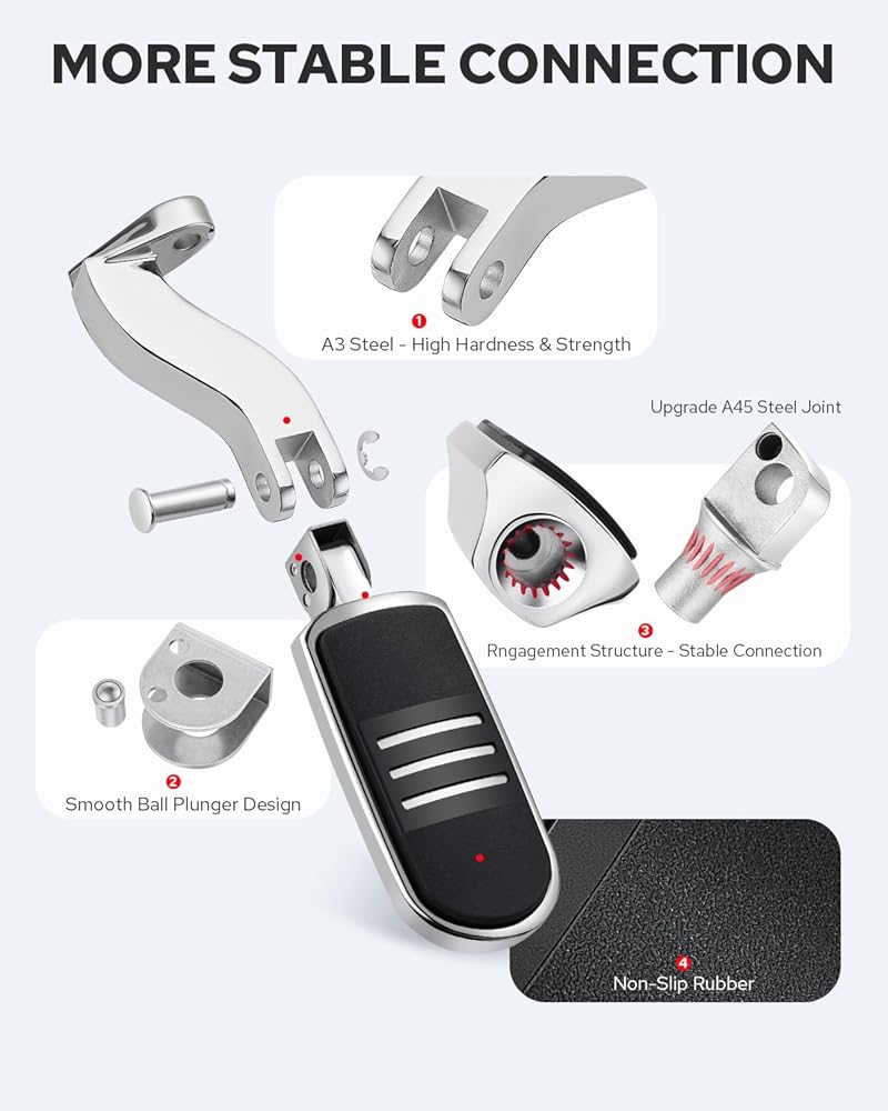 More Stable Connection. Benlari passenger footpeg with upgrade A45 steel joint has better load bearing. Benlari footpegs with rngagement structure have more stable connection
