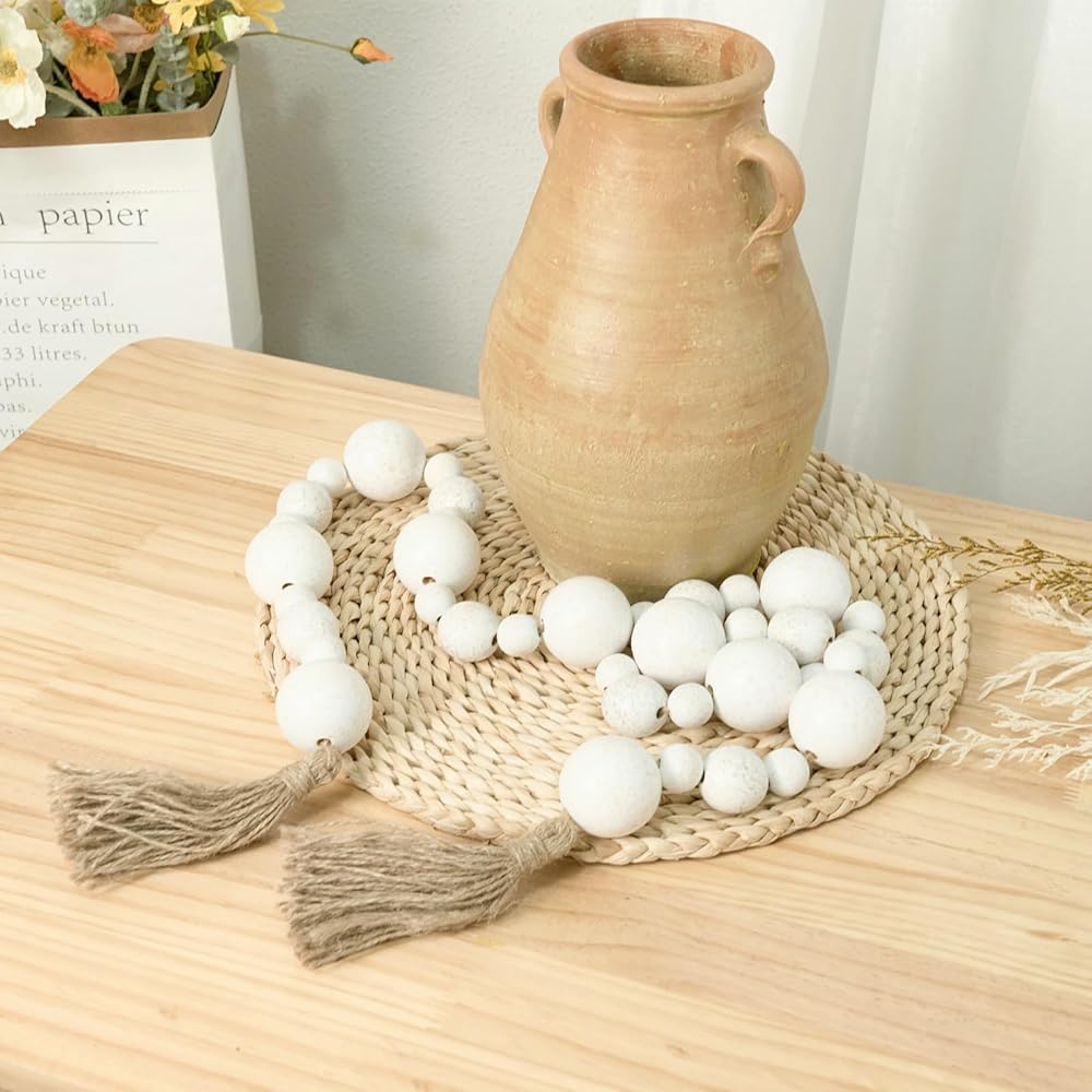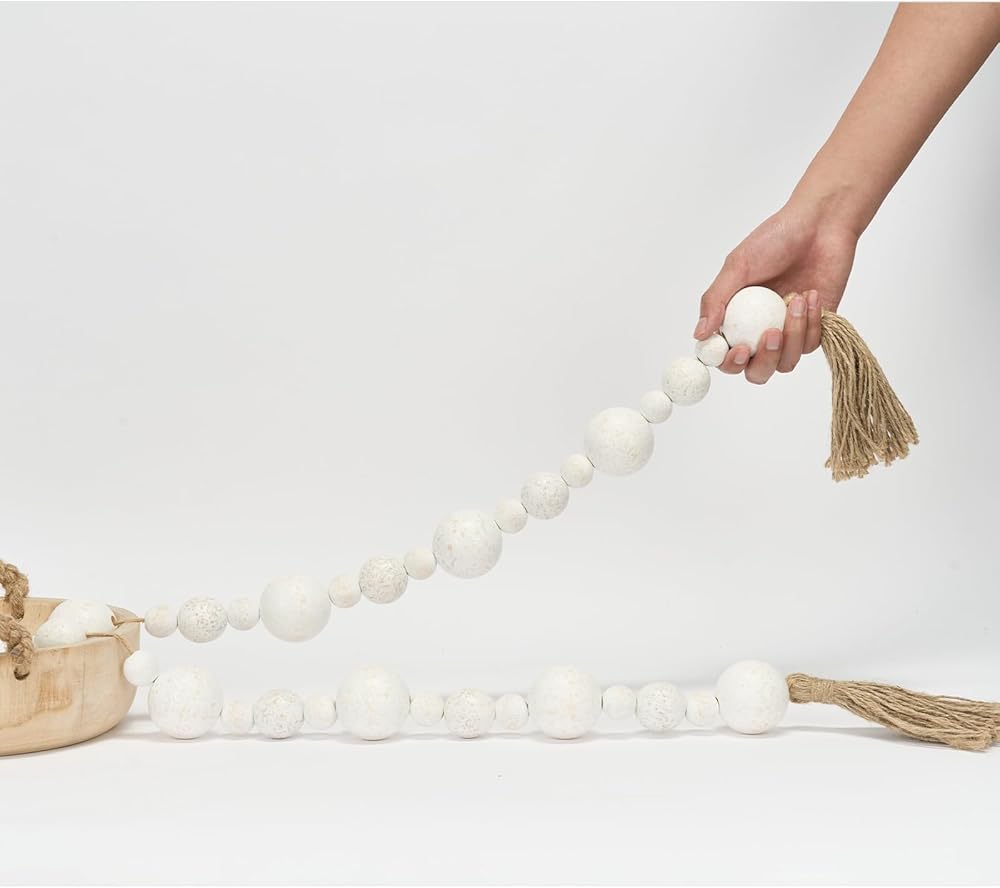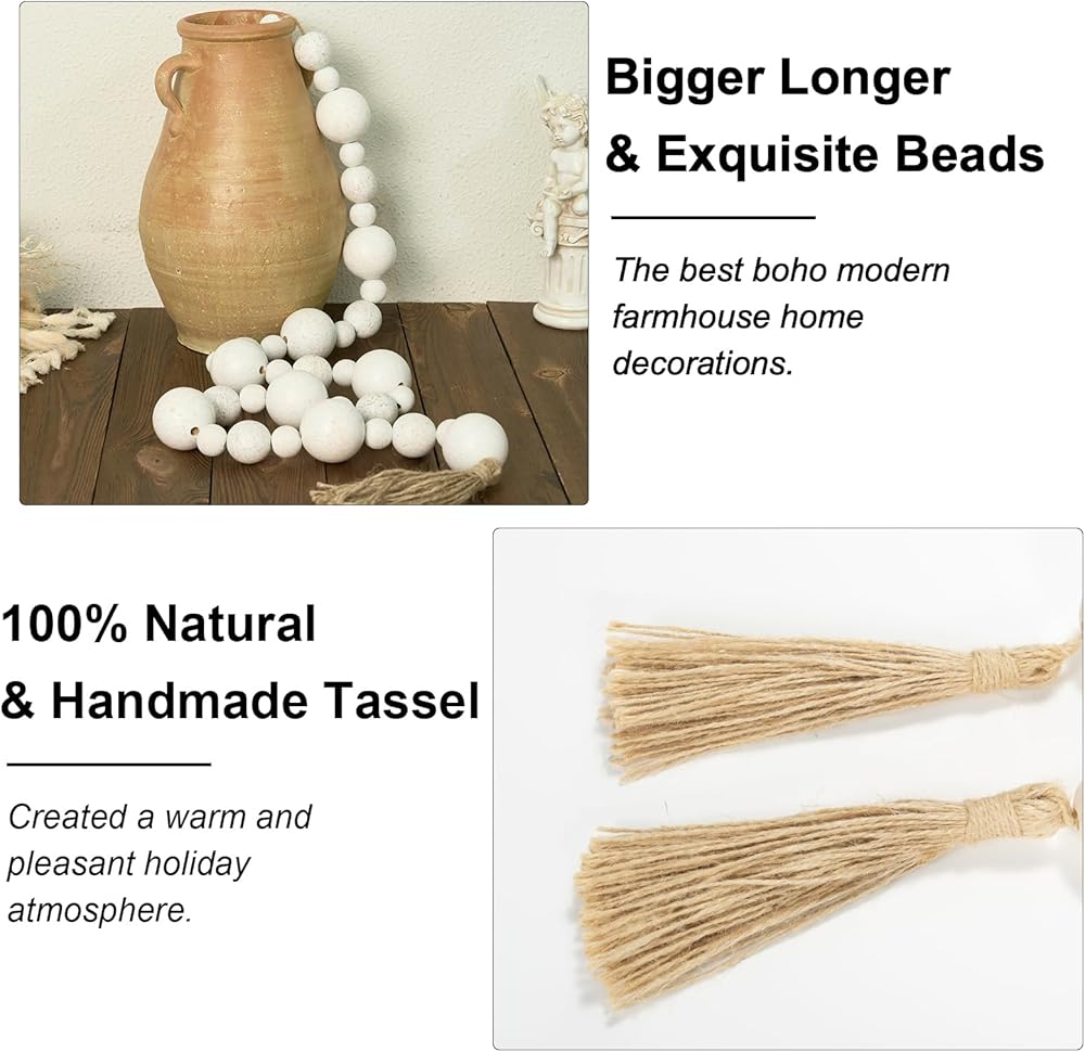 PERFECT EXTRA LARGE DECORATIONS: Extra large 44 inches long wooden garland decor, can be placed on any antique bowl, table, bookshelf, coffee table, mantle, dining room table, living room, farmhouse, perfect length for boho decor and minimalist modern decor. Each beige large decorative beads is a well-polished natural wood bead with a unique look and pattern, with 2 large tassels handmade with natural jute rope, the tassels are 6.7 inches long to maximize the natural beauty.
