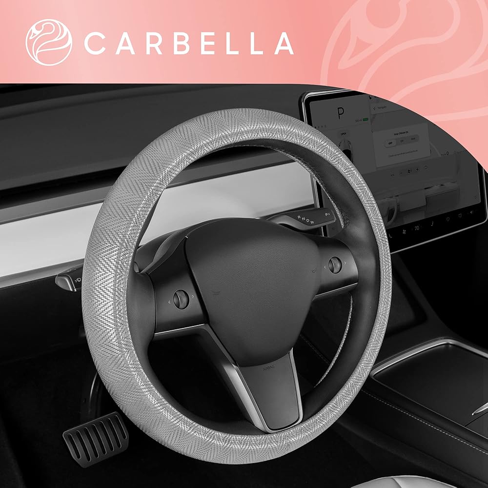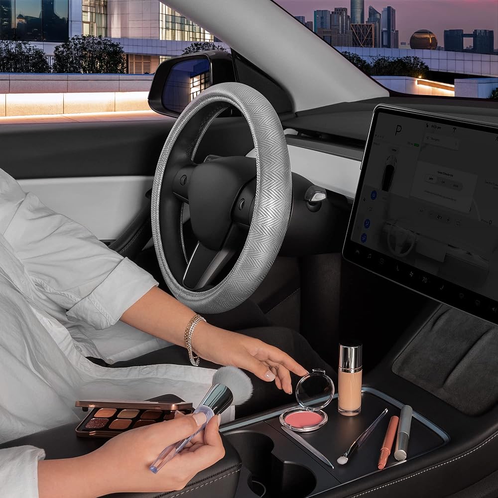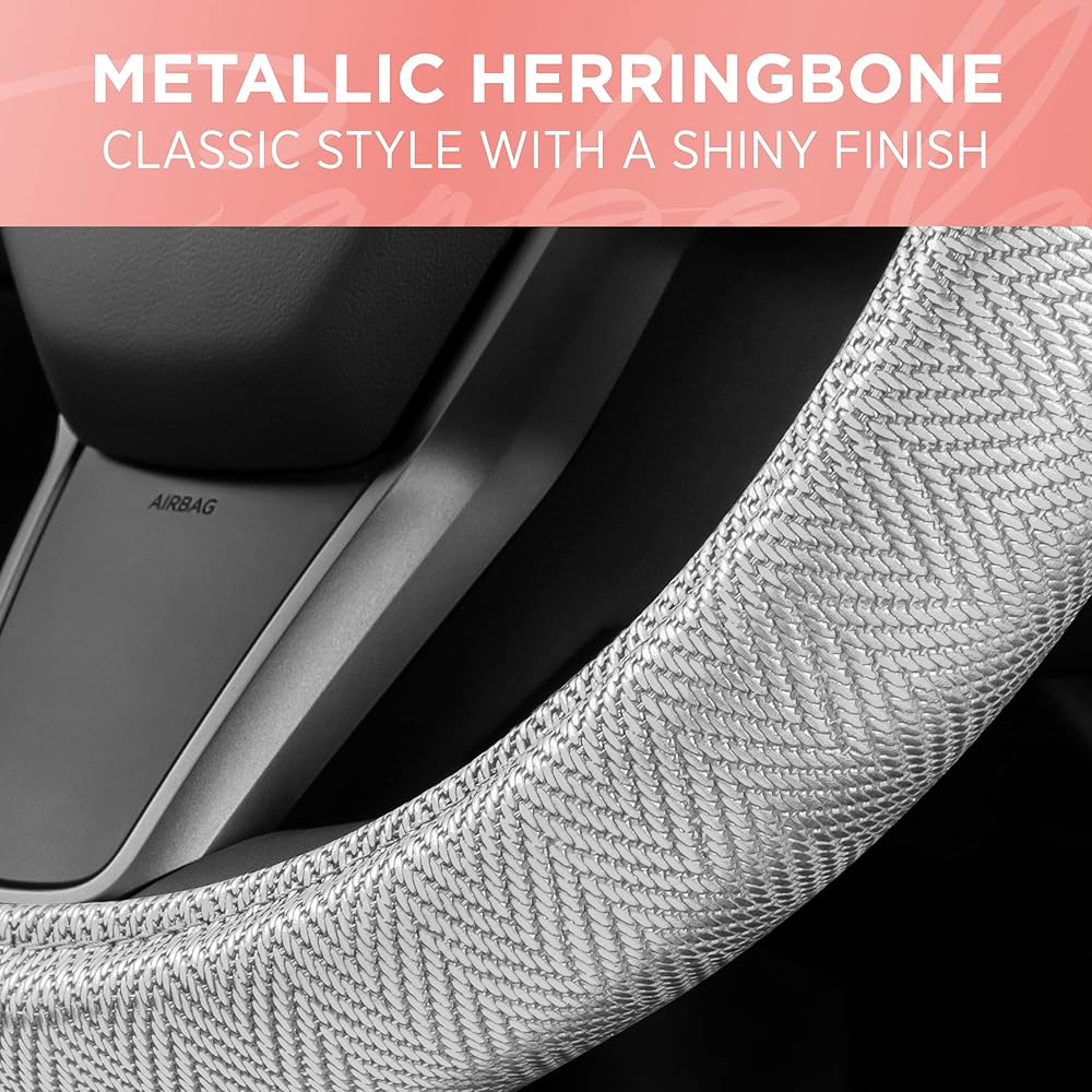 Carbella Silver Steering Wheel Cover, Standard 15 Inch Size Fits Most Vehicles, Cute Shiny Bling Car Steering Wheel Cover with Herringbone Detail, Car Accessories for Women