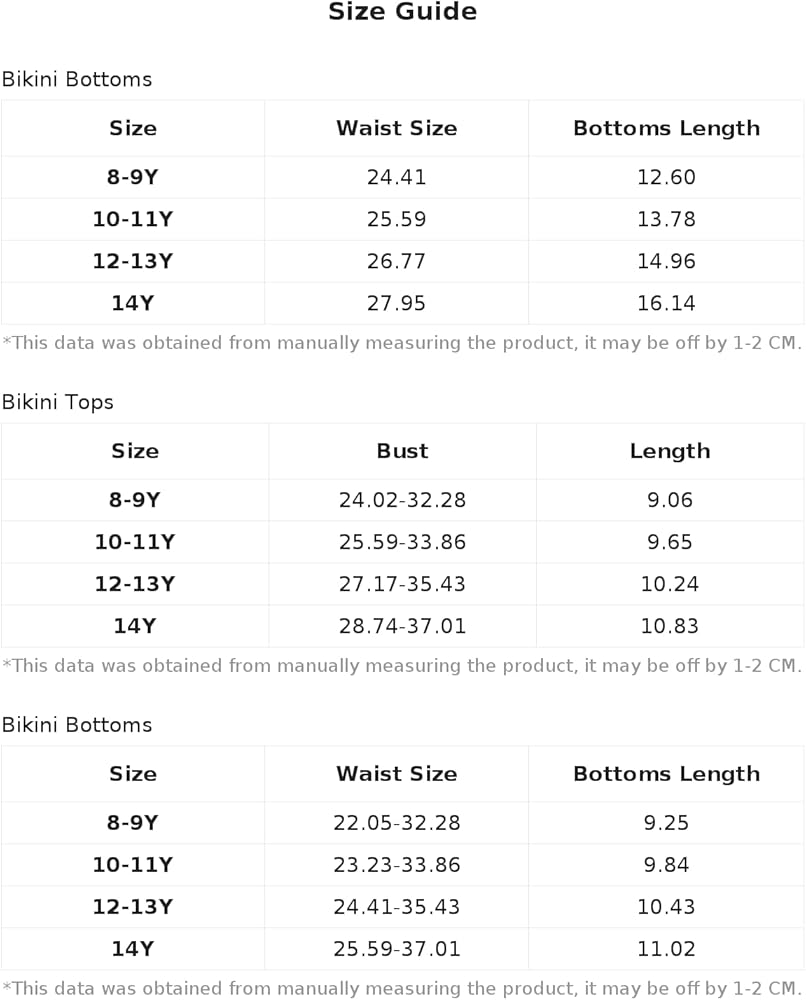 12-13Y:Bottoms Length:10.4IN,Waist Size:24.4-35.4IN,Waist Size:26.8IN,Bottoms Length:15.0IN,Bust:27.2-35.4IN,Length:10.2IN