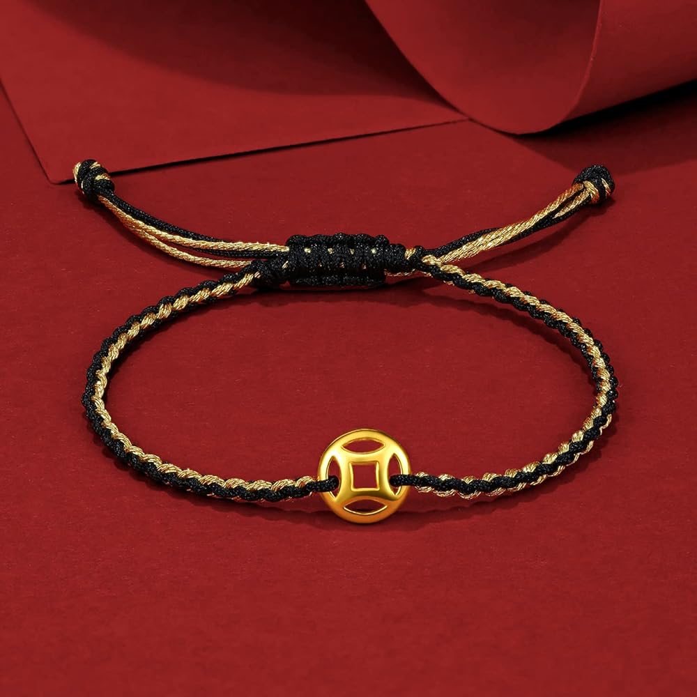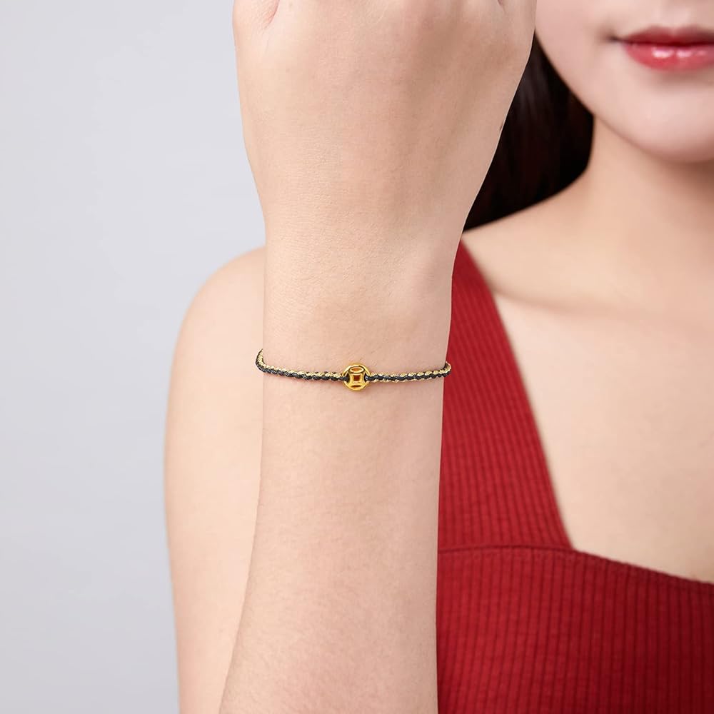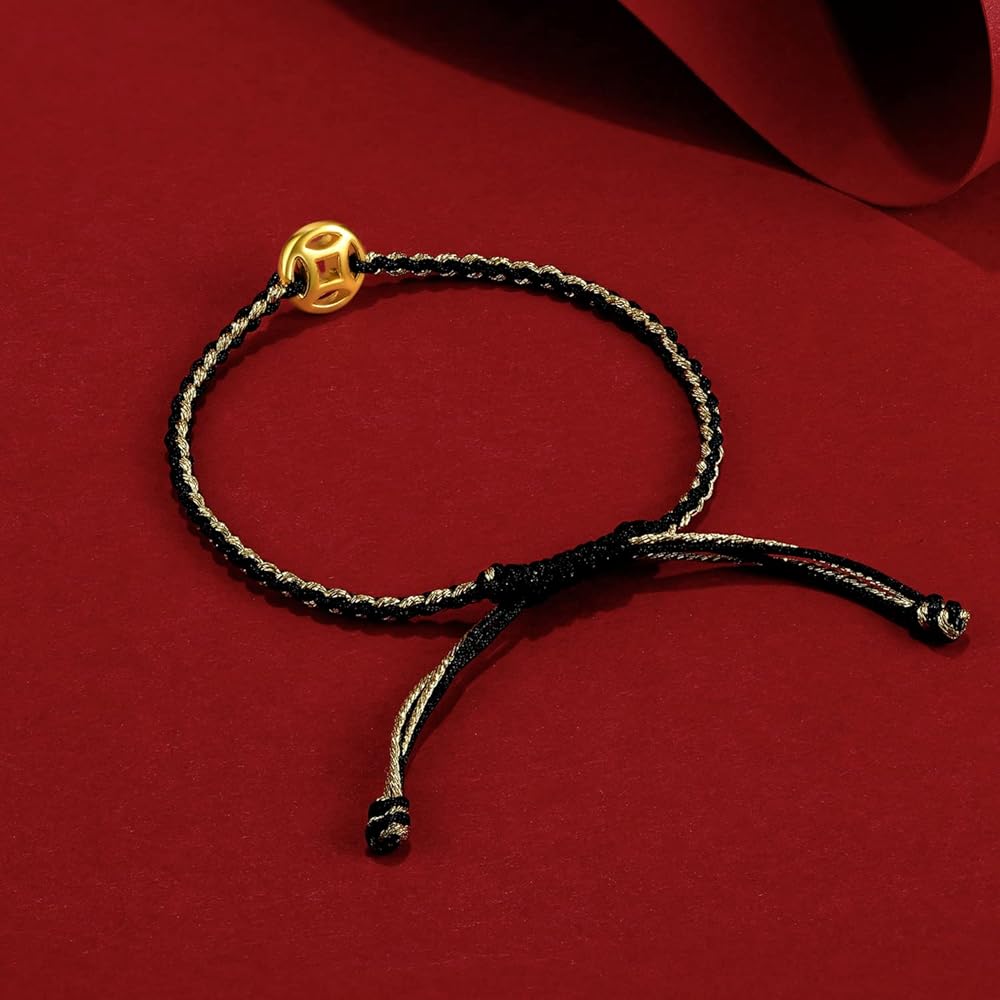 ZHOU LIU FU String Bracelet Solid Gold Charm Bracelets Black Lucky Coins Gold Jewelry Cool Bracelets Unisex for Women Men Adults Girlfriend Friendship Couple Bracelet Pure Gold Not Gold Plated