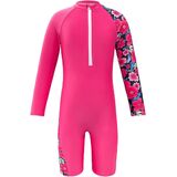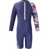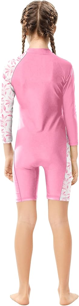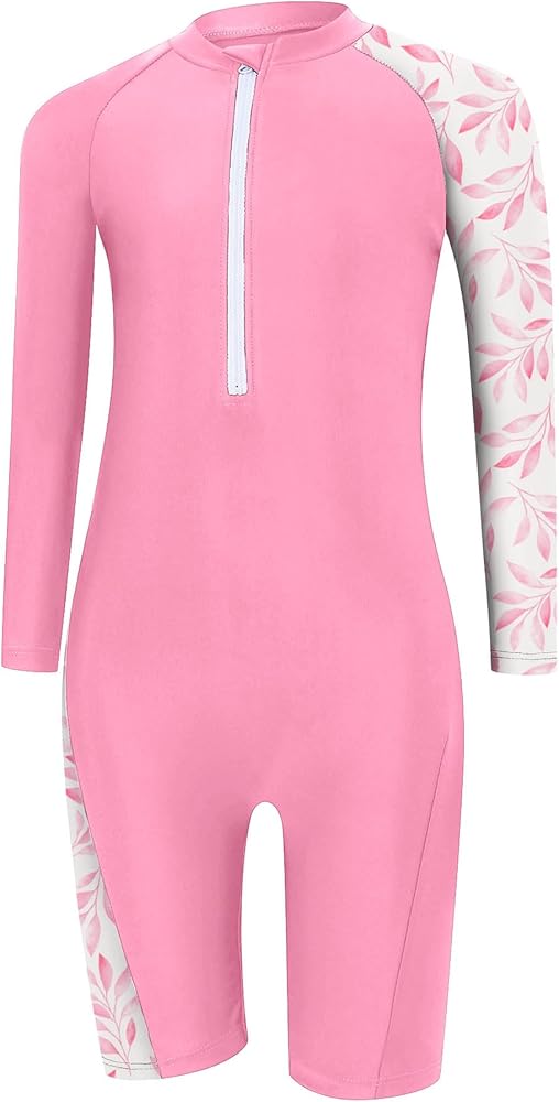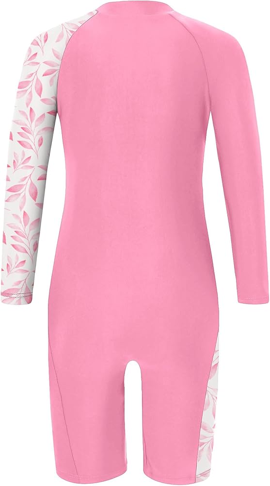 【Kids Rash Guard Swimsuit Design】Long sleeve one piece swimsuit, floral print patchwork swimsuit with zipper closure, crew neck design, easy to put on and off.