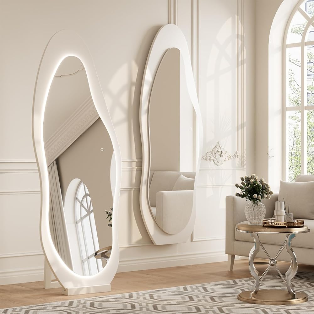 WoodsWhisper 69"X 24" Soild Wood Mirror Full Length,Wavy Wall Mirror,Lights Irregular Led Full Length MirrorShatter-Proof Hanging or Leaning Against Wall for Cloakroom/Bedroom/Living Room(White)
